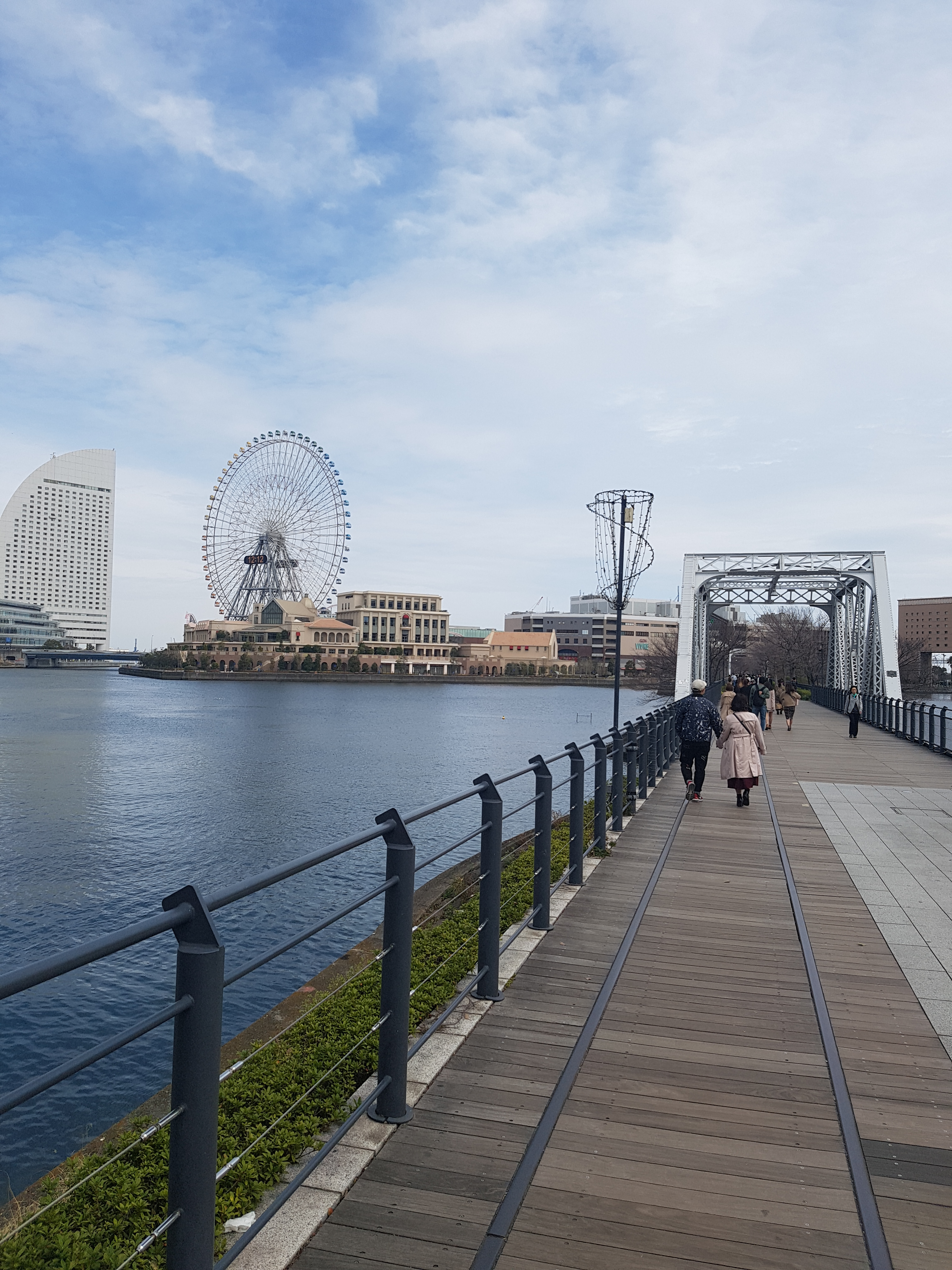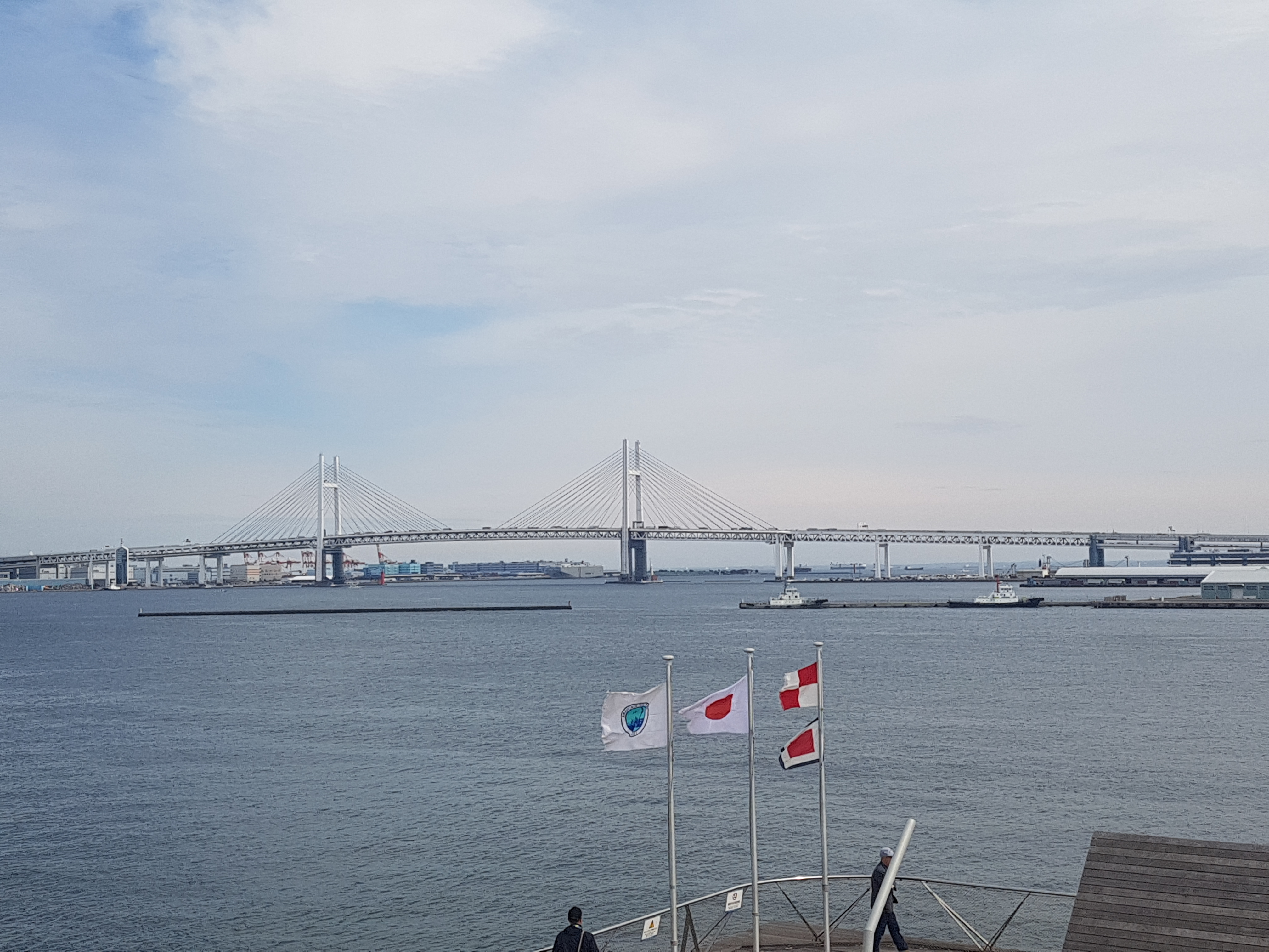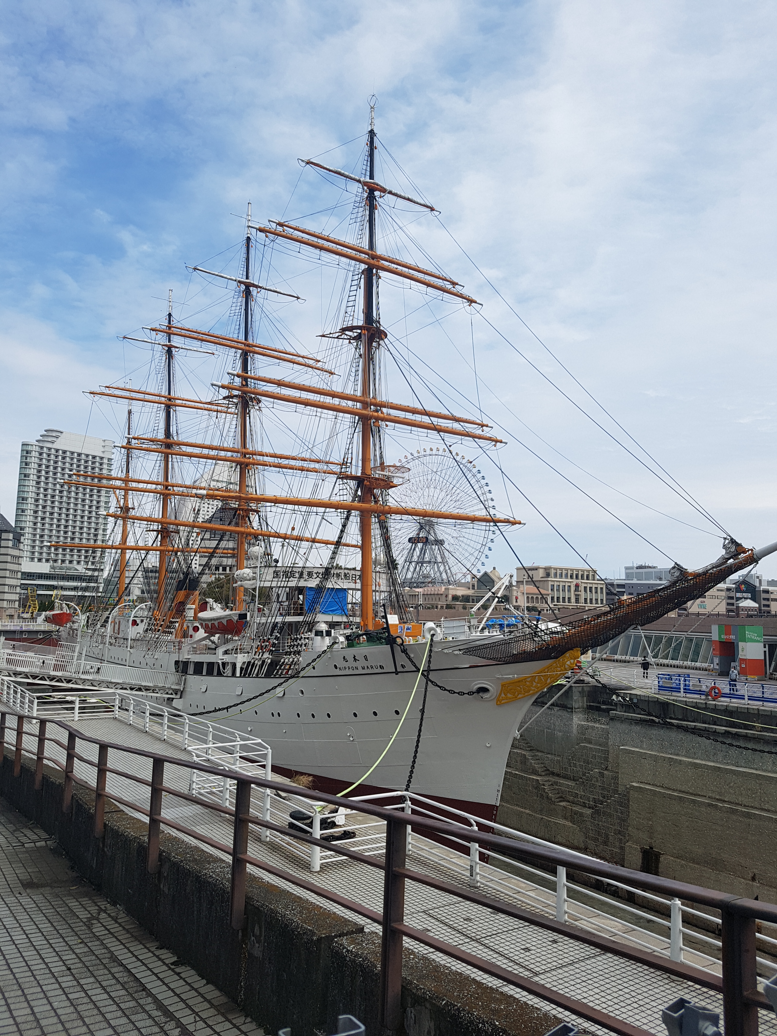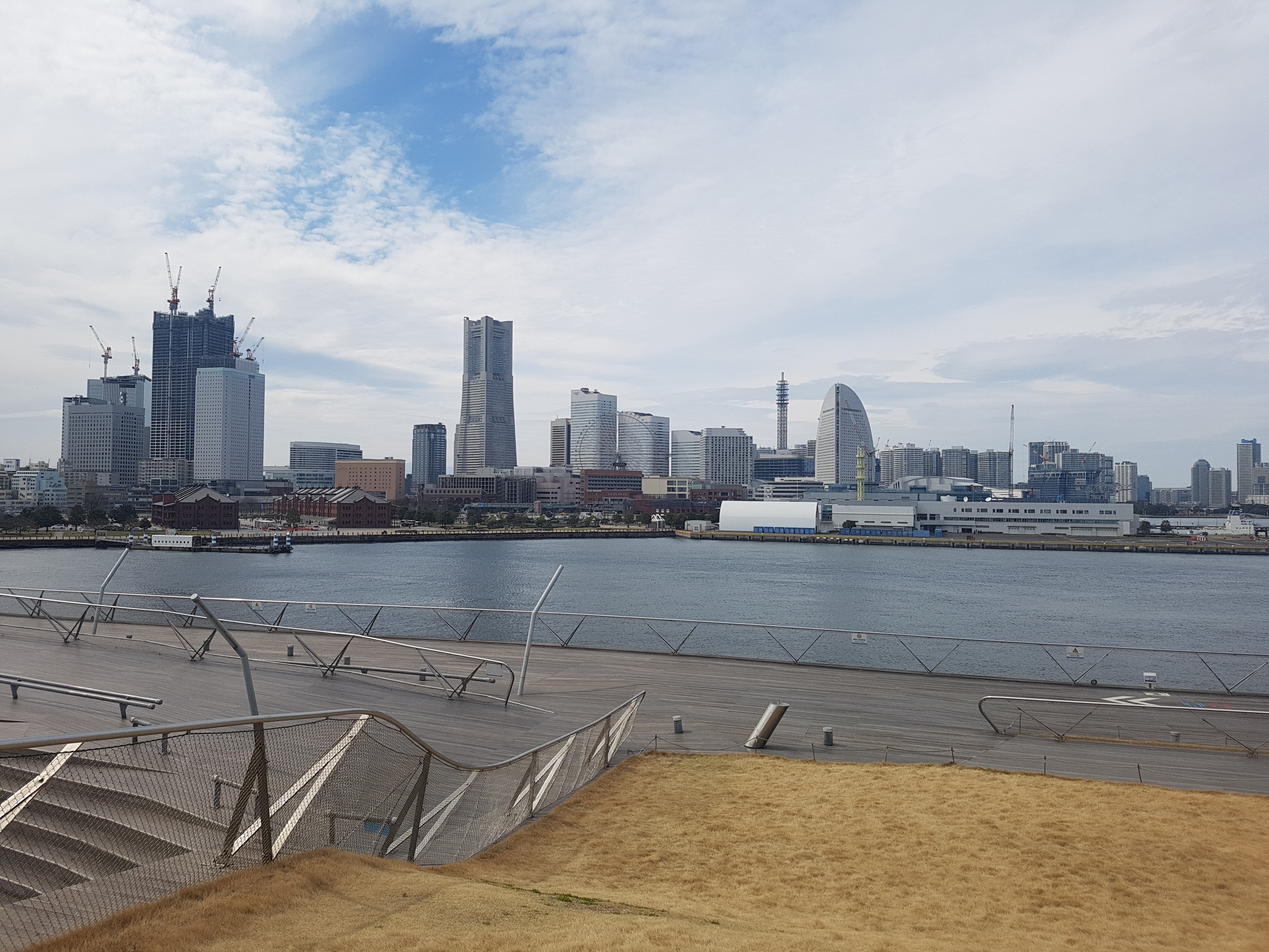 Vom Hotel aus sind wir vorbei am historischen Schiff „Nippon-maru“ über die Kishamichi-Promenade bis zum Osanbashi-Pier gelaufen, wo die Kreuzfahrtschiffe anlegen. Dort lag heute kein Schiff vor Anker und wir konnten die tolle Aussicht auf die Stadt und die Bucht von Yokohama genießen.