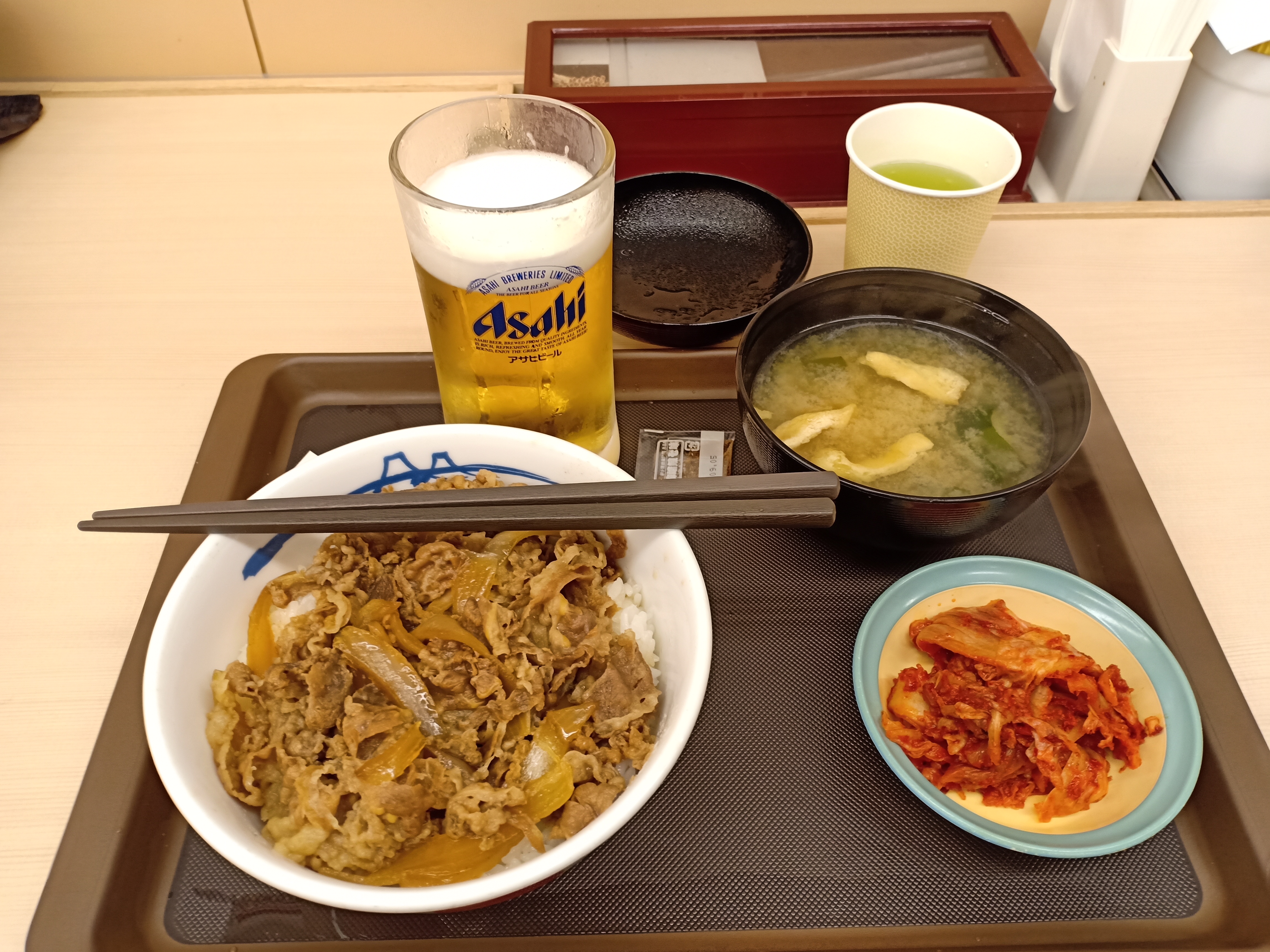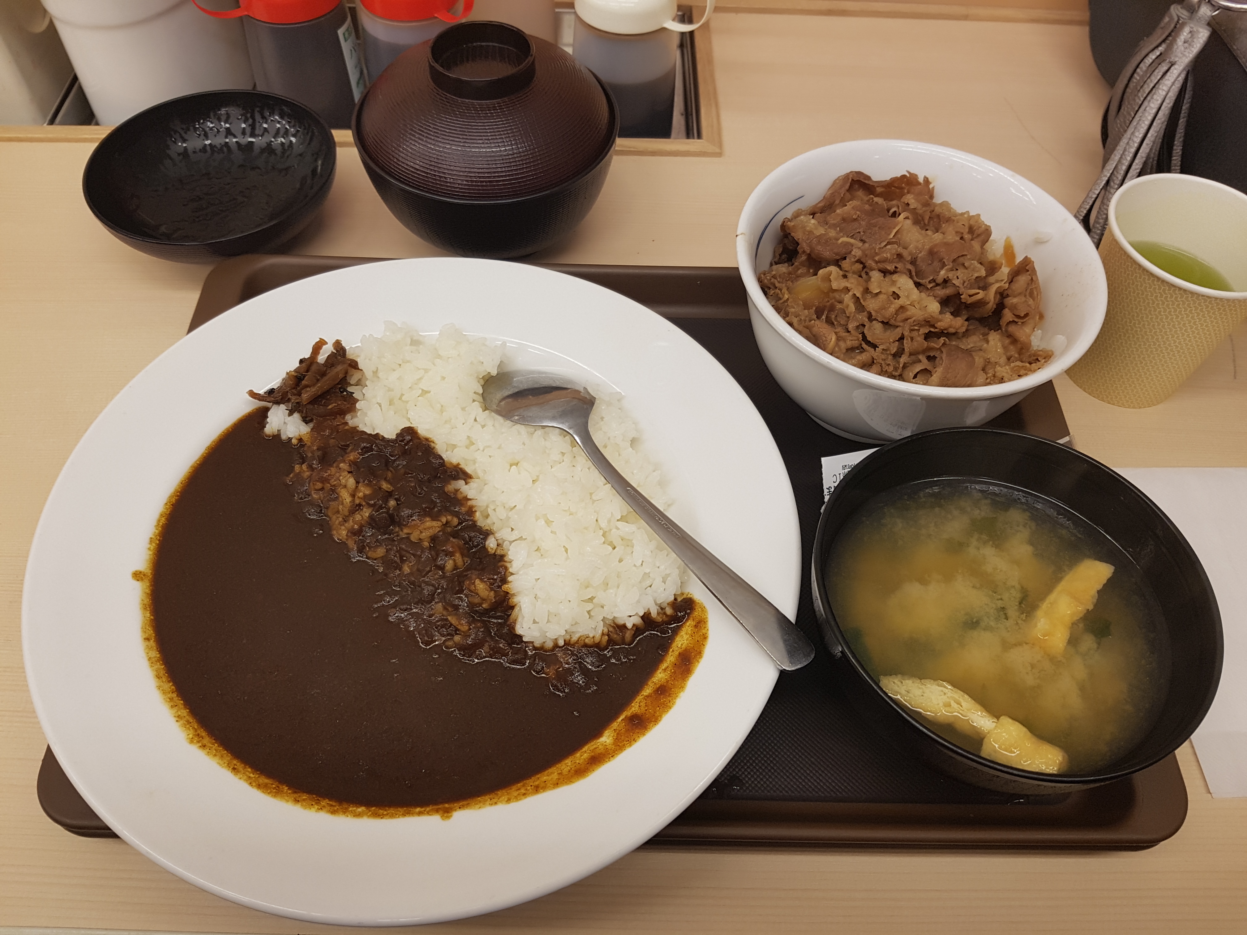 Curry-Reis, Gyudon (hauchdünnes Rind-/Schweinefleisch auf Reis), Miso-Suppe und Kimchi (scharf eingelegter Chinakohl)