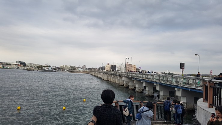 Nach etwa 15 Minuten erreichen wir die Haltestelle Enoshima und folgen der Masse das kurze Stück durch die örtliche Einkaufs- & Souvenirmeile zur Küste. Durch eine Fußgängerunterführung kommen wir auf die Brücke, die die Insel mit dem „Festland“ verbindet.