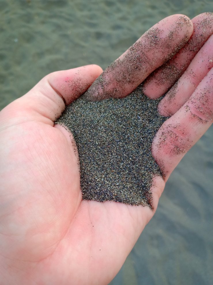 Der Sand am Strand sah, besonders nass, fast tiefschwarz aus. Sicher auf die Vulkanregion zurück zu führen.