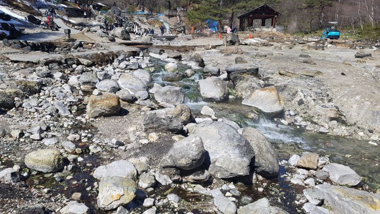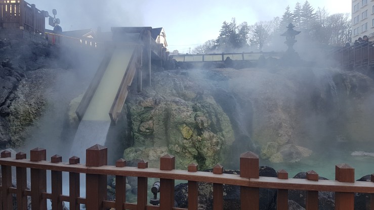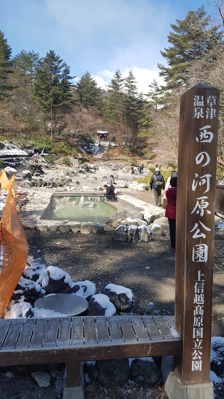 Im Sai no Kawara Park kann man in und um das heiße Wasser eines Bachs laufen und sich die Füße in einem der zahlreichen Fußbädern aufwärmen. Bei Temperaturen um den Gefrierpunkt und starkem Wind haben wir das nur einmal kurz probiert 😸