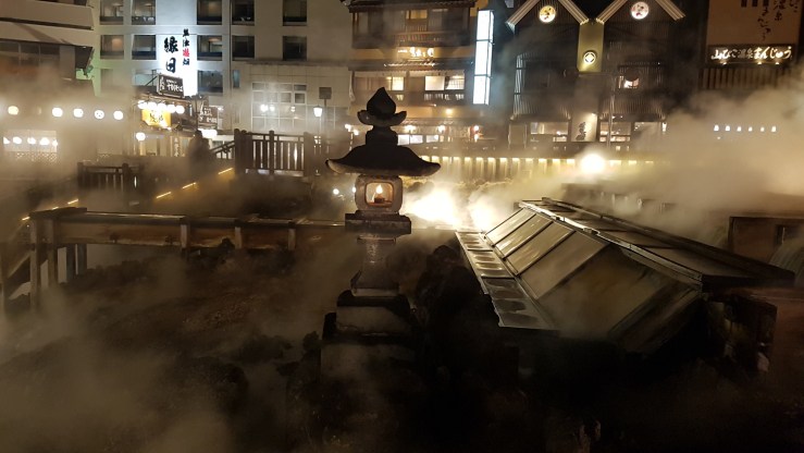 Nachdem es dunkel wurde sind wir nochmal raus in die Kälte, um den beleuchteten Yubatake zu sehen.