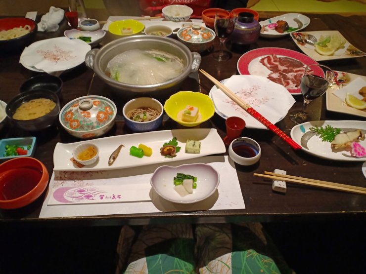 Zum Abendessen bekommen wir Shabu-Shabu (eine Art japanisches Fondue) und eine Auswahl der Kaiseki-Küche (regionale Spezialitäten).
