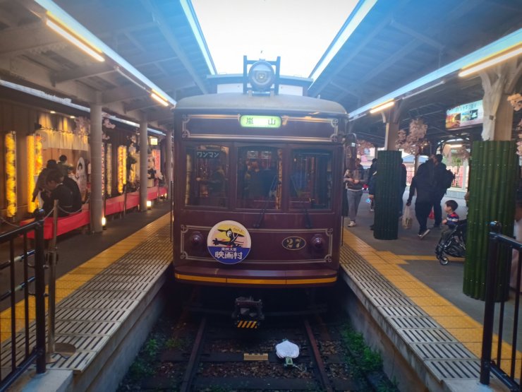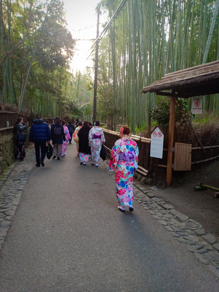 Als nächstes sind wir in den Stadtteil Arashiyama gefahren, um uns den berühmten Bambuswald anzuschauen. Auf dem Weg dorthin kamen wir an einem winzigen, hübschen Bahnhof vorbei. Hier werden Kimono-muster in vielen kleinen Säulen ausgestellt.