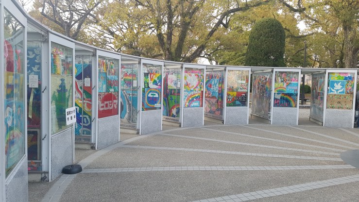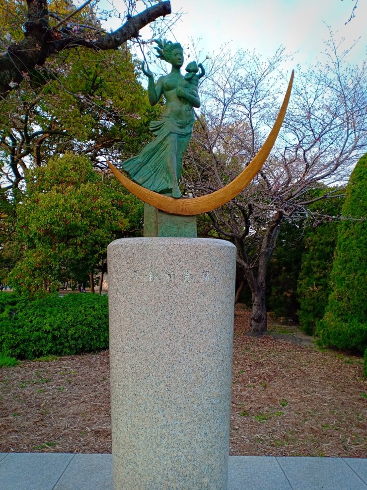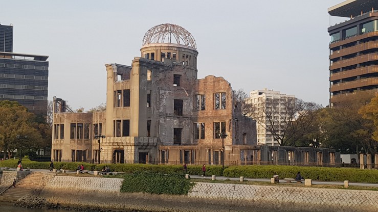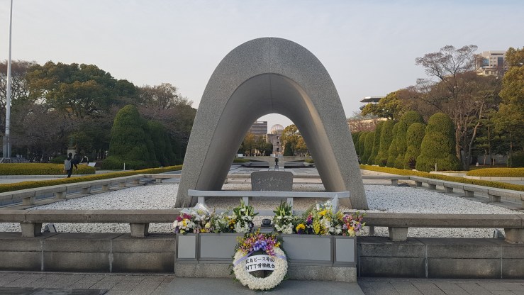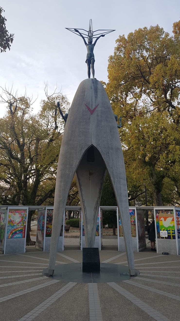 Auf dem Rückweg zum Shinkansen-Bahnhof in Hiroshima haben wir uns noch die Zeit genommen, den Friedenspark mit den Gedenkstätten des Atombombenabwurfs von 1945 zu besichtigen. Das weitläufige Parkgelände war früher das kulturelle Zentrum der Stadt, bis die Atombombe über der Mitte des Parks abgeworfen wurde.