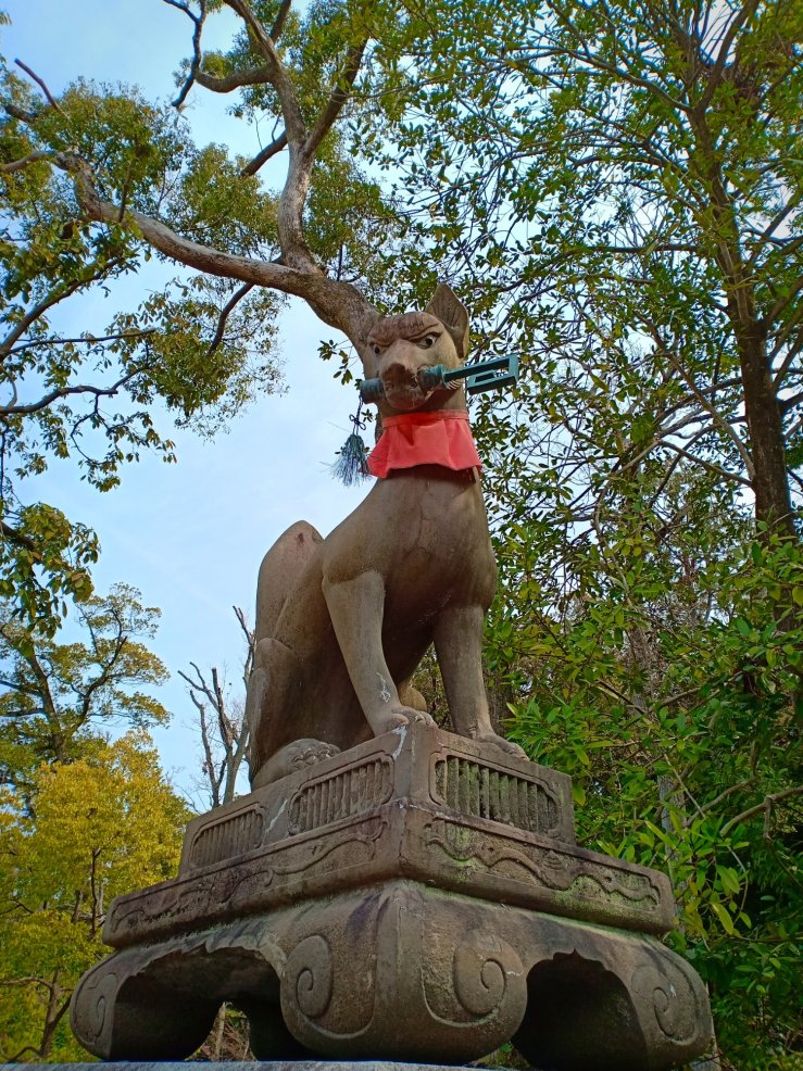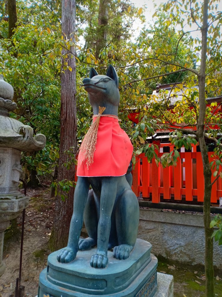 Überall gibt es Fuchsstatuen, die Boten der Reisgöttin Inari.