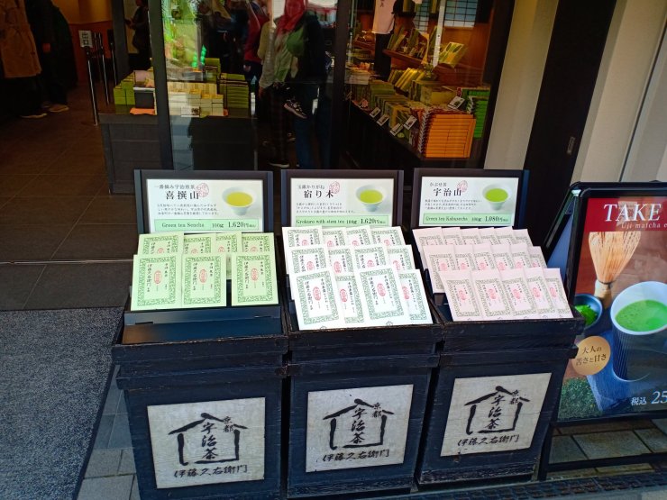 Mittags sind wir weiter in die Tee-Stadt Uji gefahren. Hier gibt es feinsten grünen Tee und eine enorme Bandbreite an Matcha-haltigen Lebensmitteln. Von Schokolade und anderen Süßspeisen über Nudeln und Bier ist alles dabei 😄