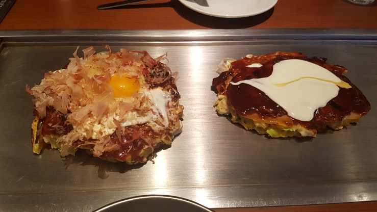Auf der berühmten Restaurant-Meile Dotonburi haben wir die lokale Spezialität Osakas probiert: Okonomiyaki (eine Art gebratener Kartoffelpuffer/Reibekuchen, belegt mit Allerlei Fleisch, Fisch und/oder Gemüse)