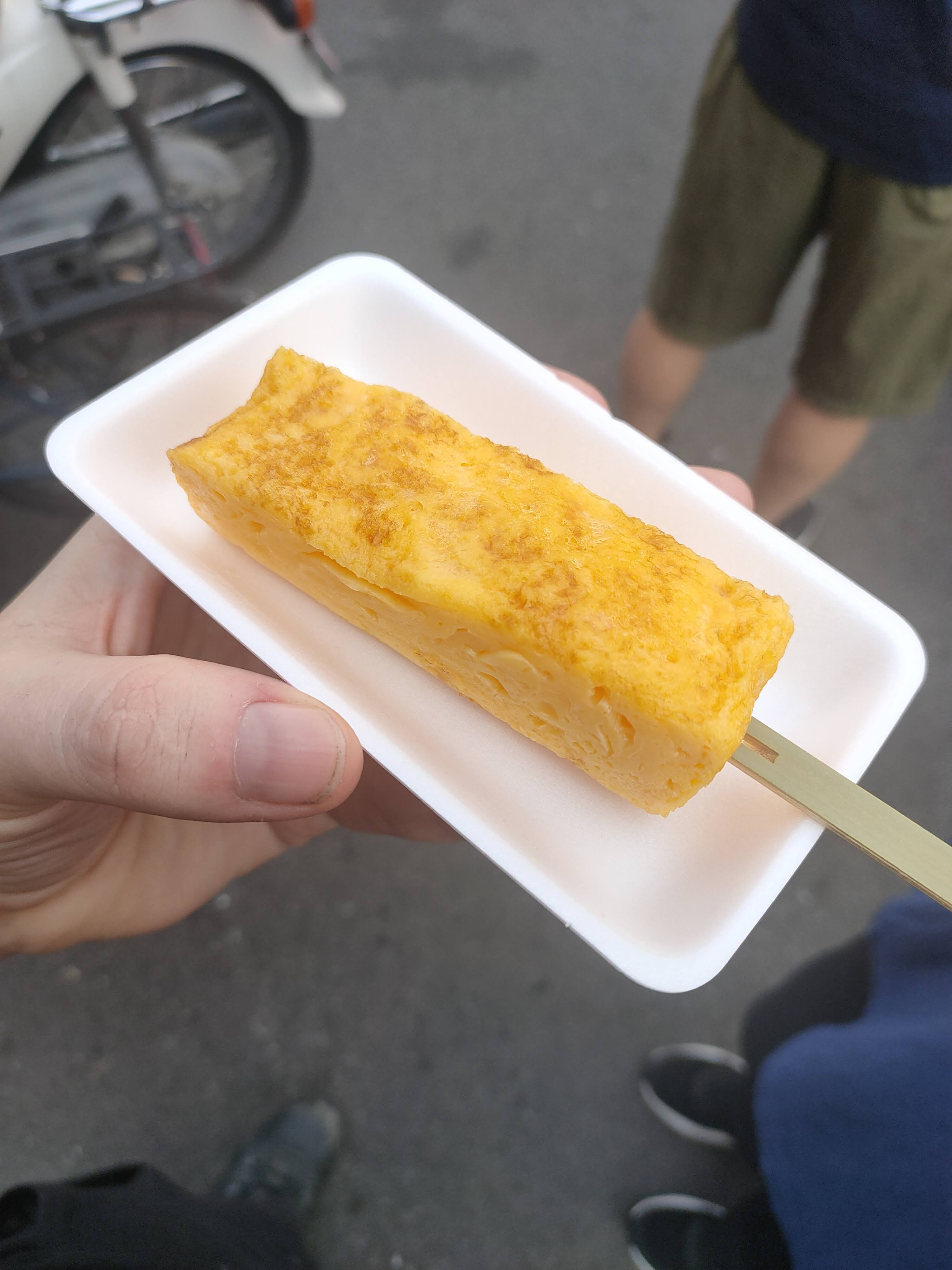 Nach einer Brücke kommt man wieder den „gewöhnlichen“ Teil der Stadt und ist in wenigen Minuten auch schon in Tsukiji. Der berühmte, alteingessene Fischmarkt ist vor ein paar Jahren an einen neuen, größeren und modernen Standort in der Stadt umgezogen, aber die Umgebung mit den vielen frischen Essensständen ist geblieben und lädt zum Snacken ein.