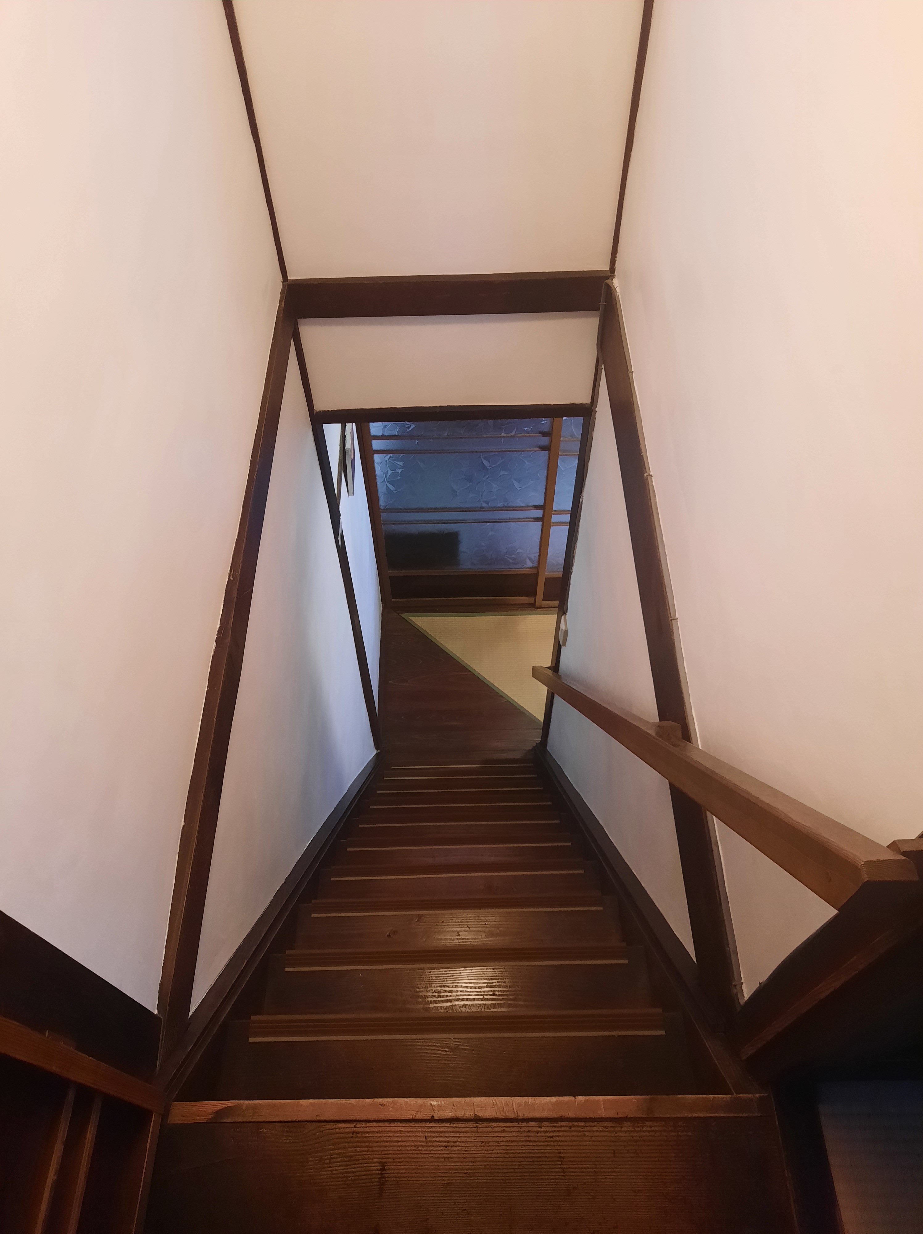 Über eine steile Holztreppe erreicht man den zweiten Stock in dem sich der Schlafbereich befindet. Wie im Erdgeschoss in Form eines großen, teilbaren Tatami-Zimmers. Hier schläft man auf Futon, dem klassischen japanischen Bett (dünne Matratze ohne Bettgestell, direkt auf den Tatami-Matten).