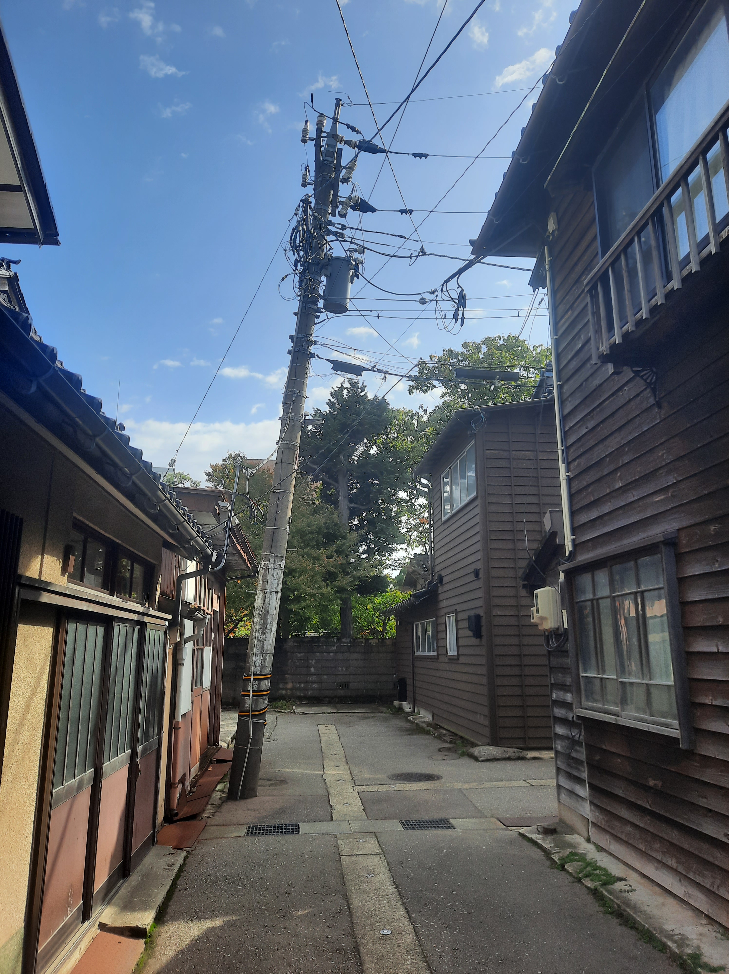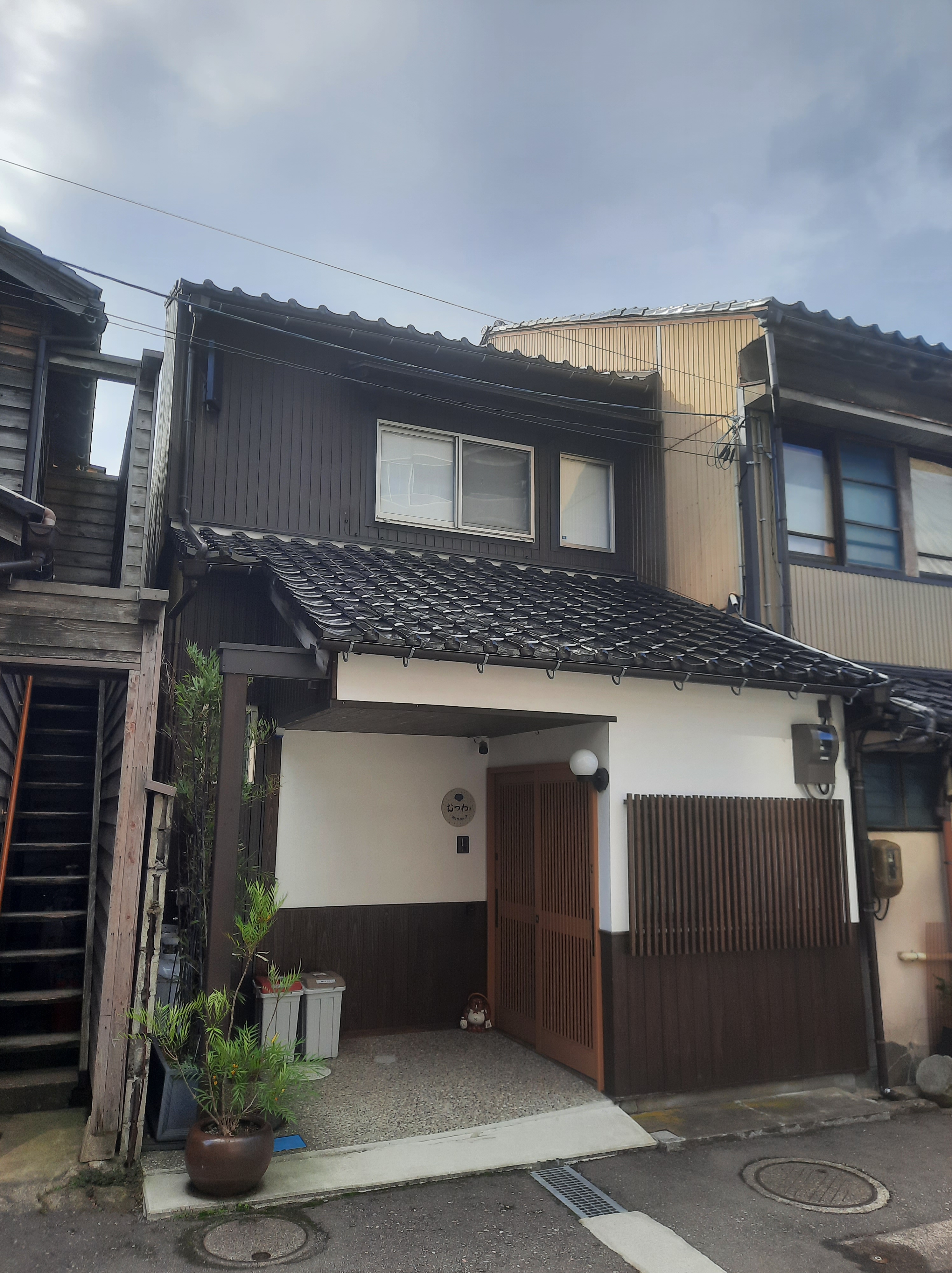 Unsere Machiya steht versteckt in einer unscheinbaren Gasse, die man schnell übersieht, zusammen mit anderen Machiya. Ein paar sind auch renoviert, eine wird gerade renoviert und ist eine Baustelle voller Schreiner und andere sind in zweifelhaftem Zustand von Holztoren verdeckt.