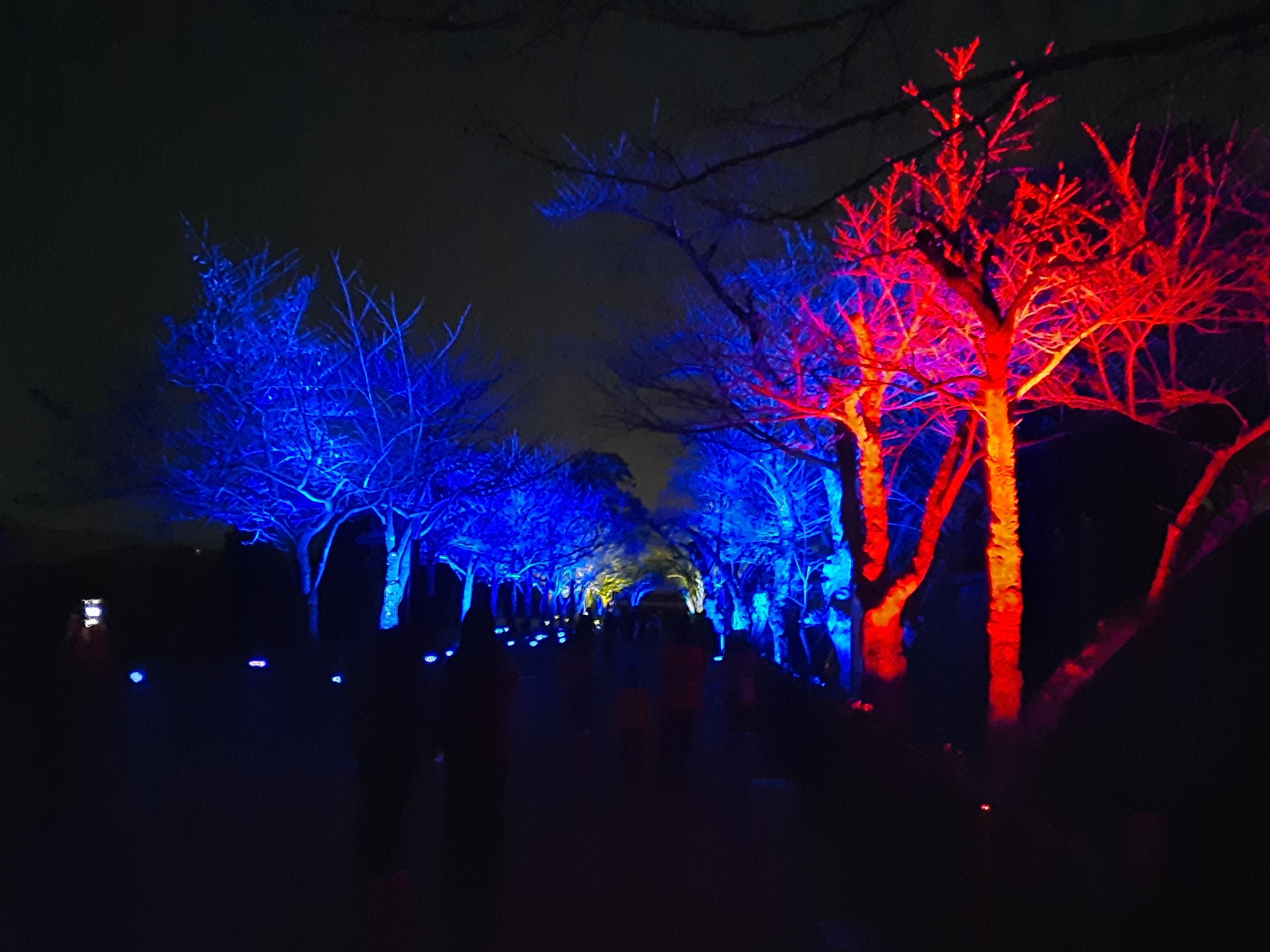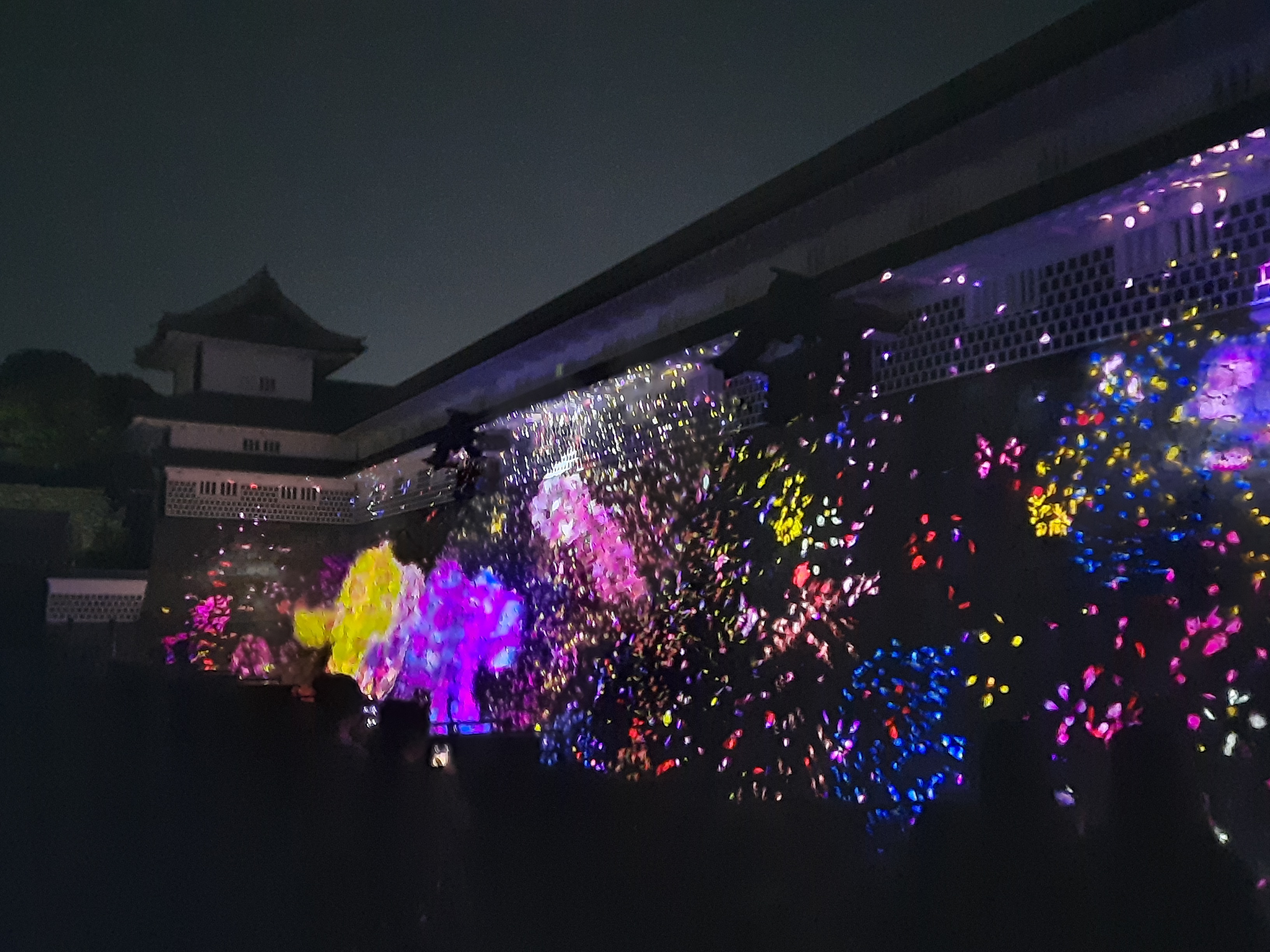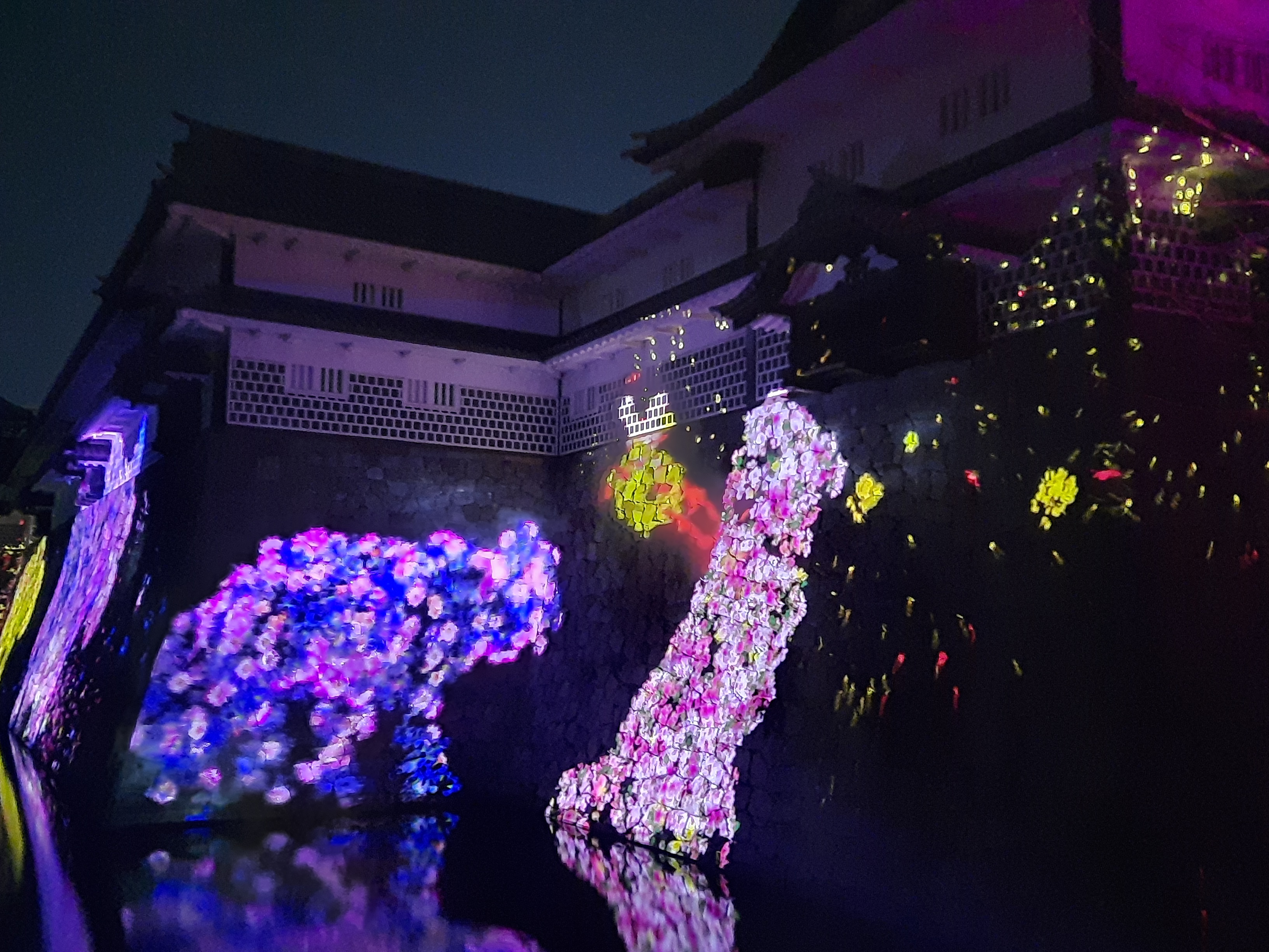 Auf der Rückseite der inneren Burg laufen wir durch den langen, kahlen Kirschblütenkorridor. Die Beleuchtung der Bäume ändert die Farbe, wenn man vorbei läuft und setzt sich nach vorne fort.