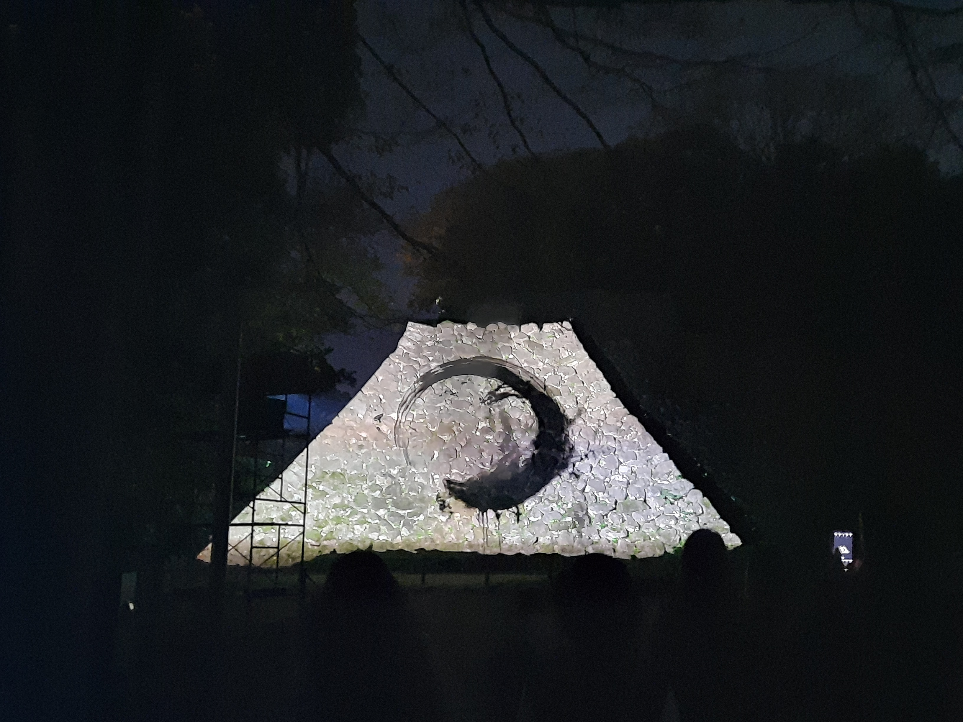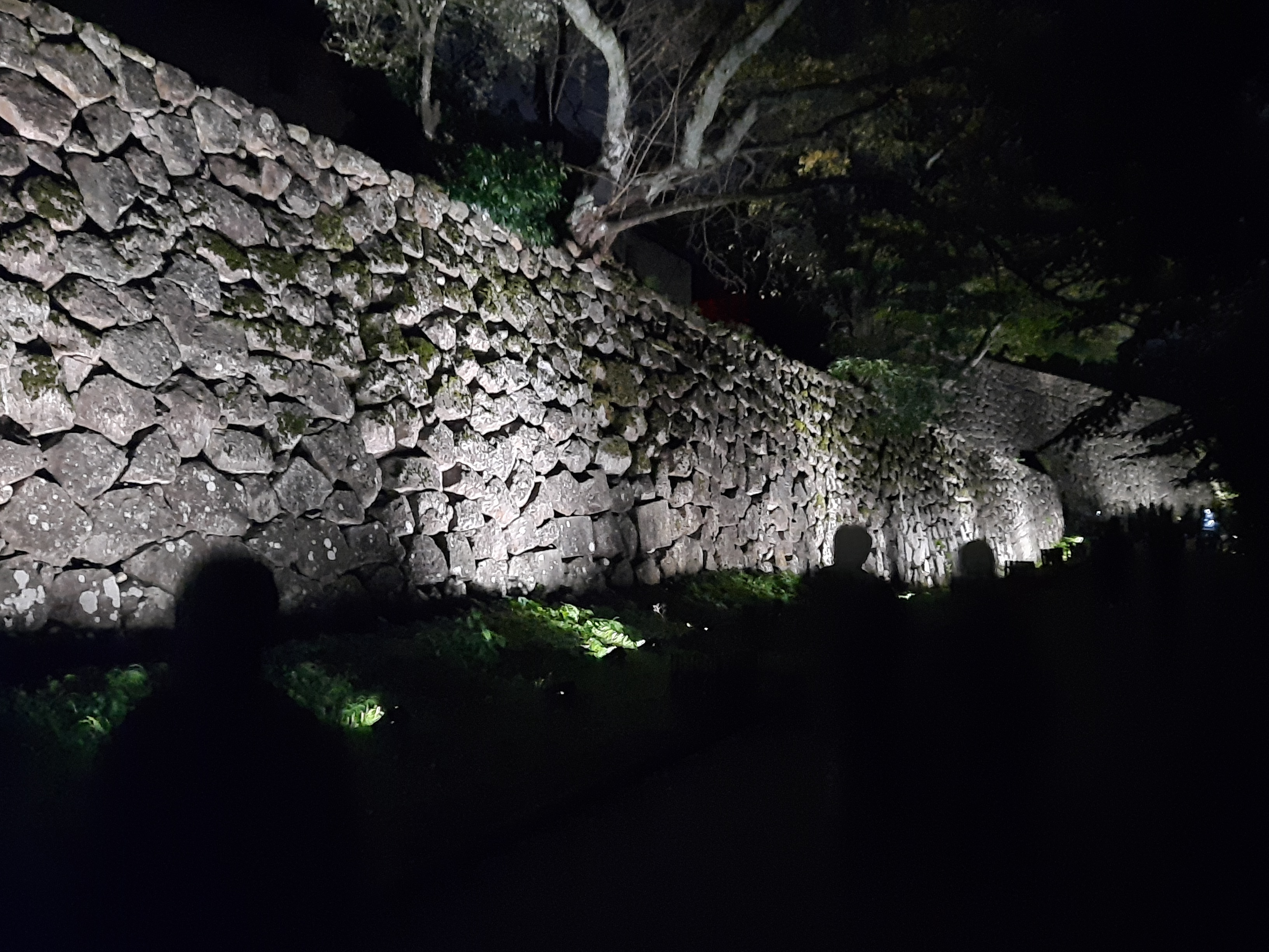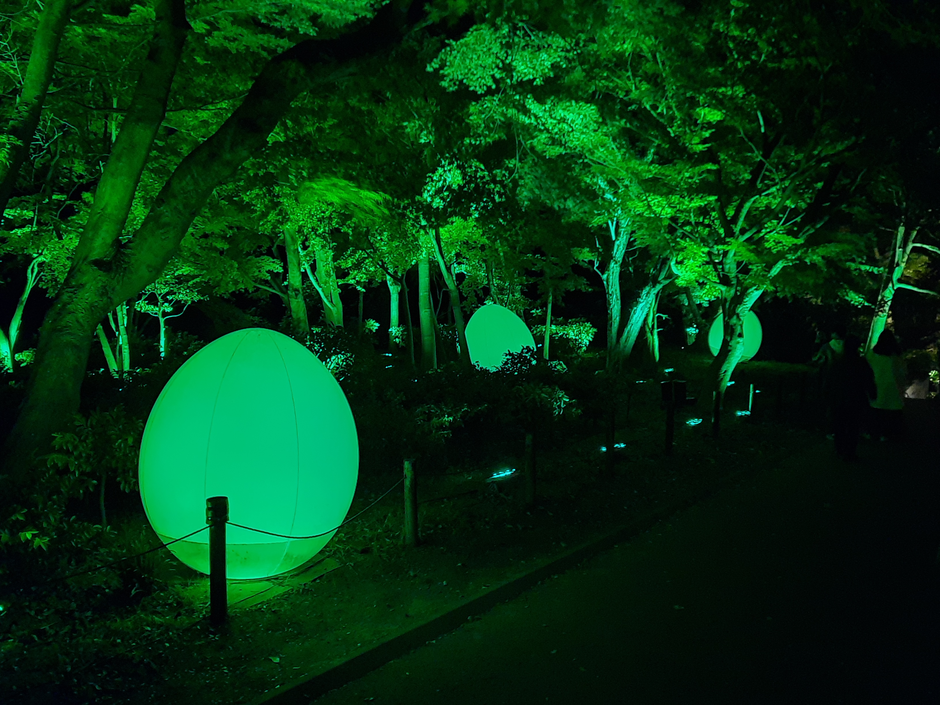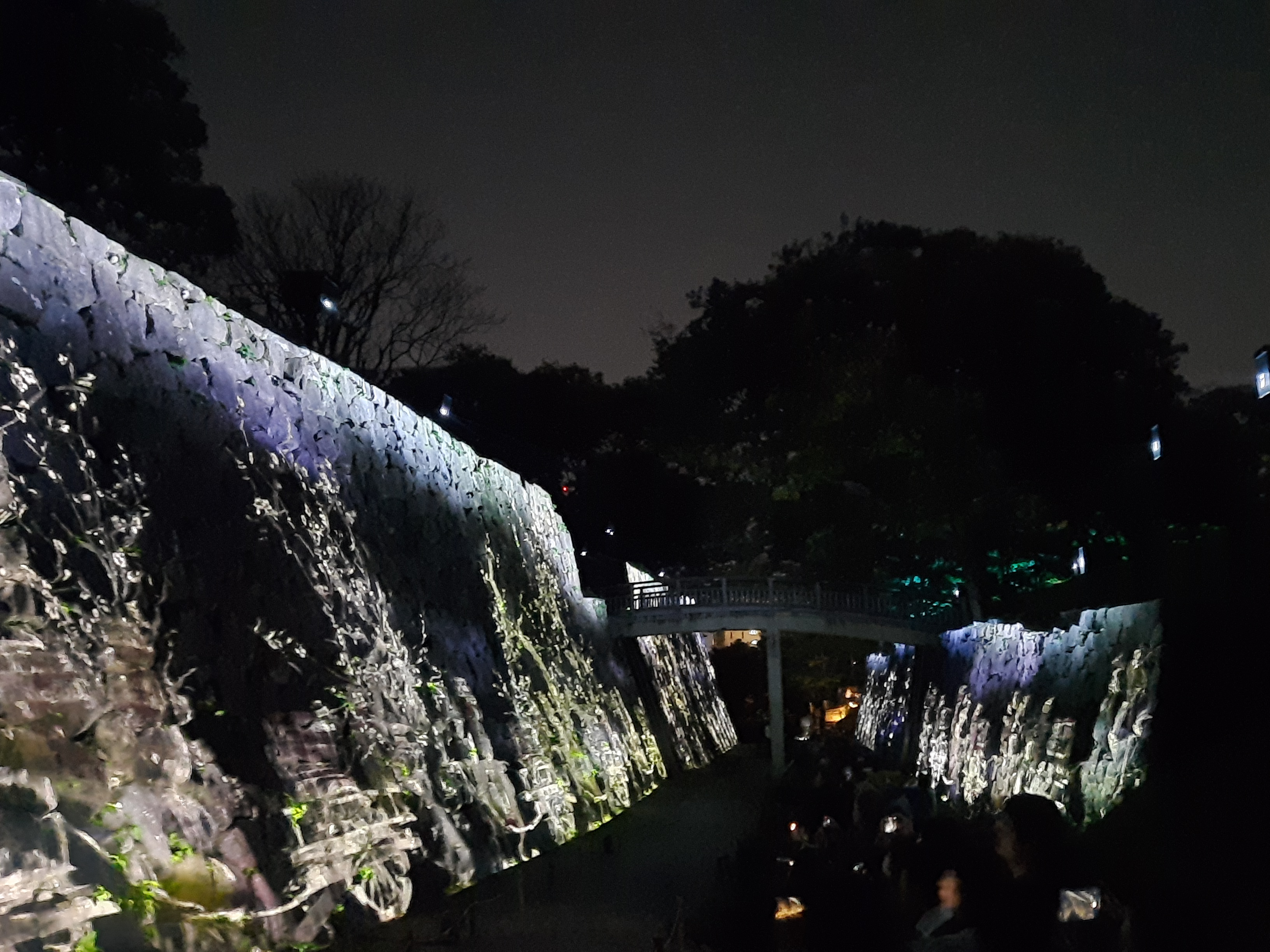 Auf der Rückseite der inneren Burg laufen wir durch den langen, kahlen Kirschblütenkorridor. Die Beleuchtung der Bäume ändert die Farbe, wenn man vorbei läuft und setzt sich nach vorne fort.