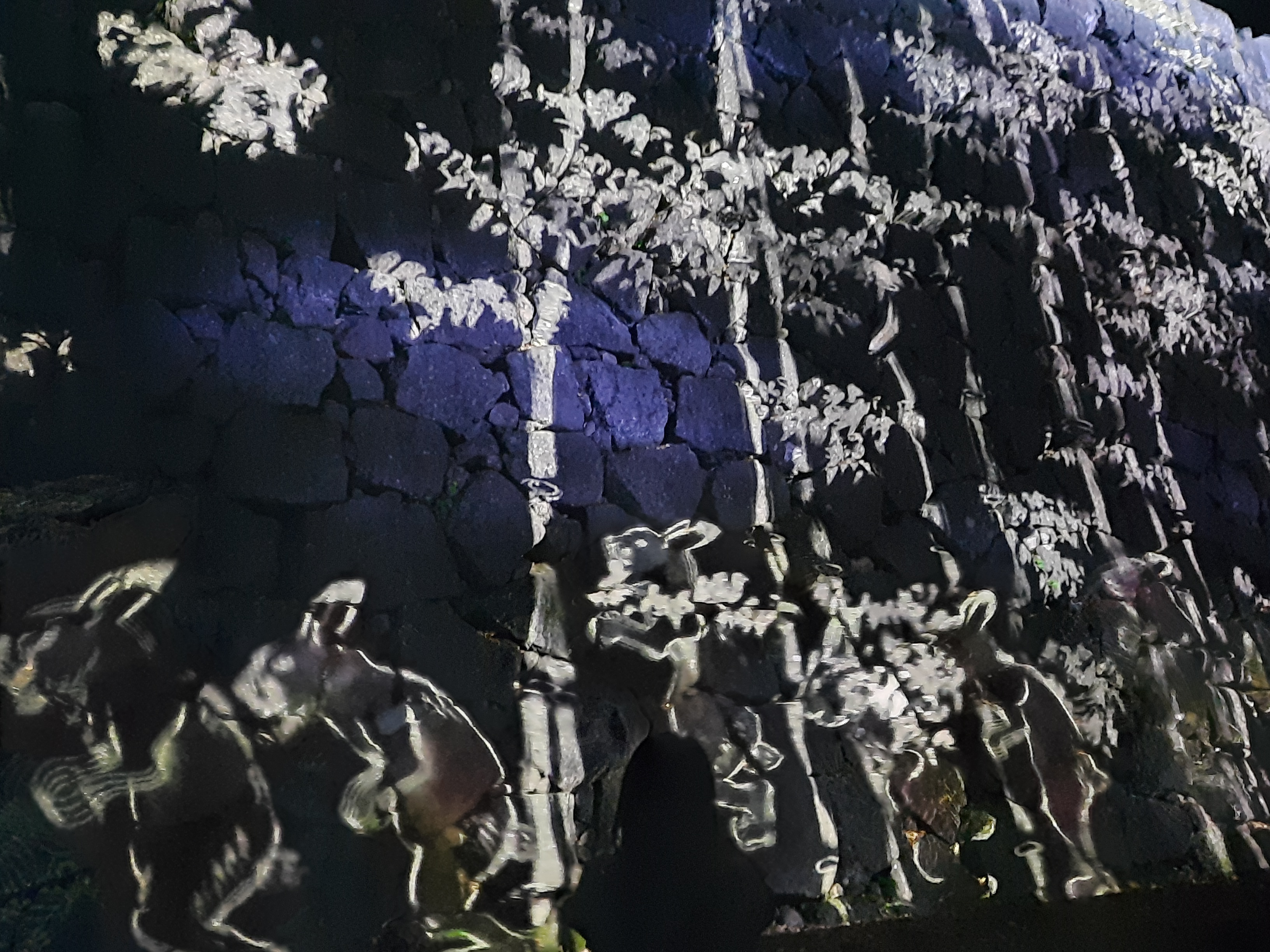 Dann laufen wir durch den Burggraben hindurch. Auf beiden Seiten sind bewegte Bilder von Tieren, die Dinge transportieren.