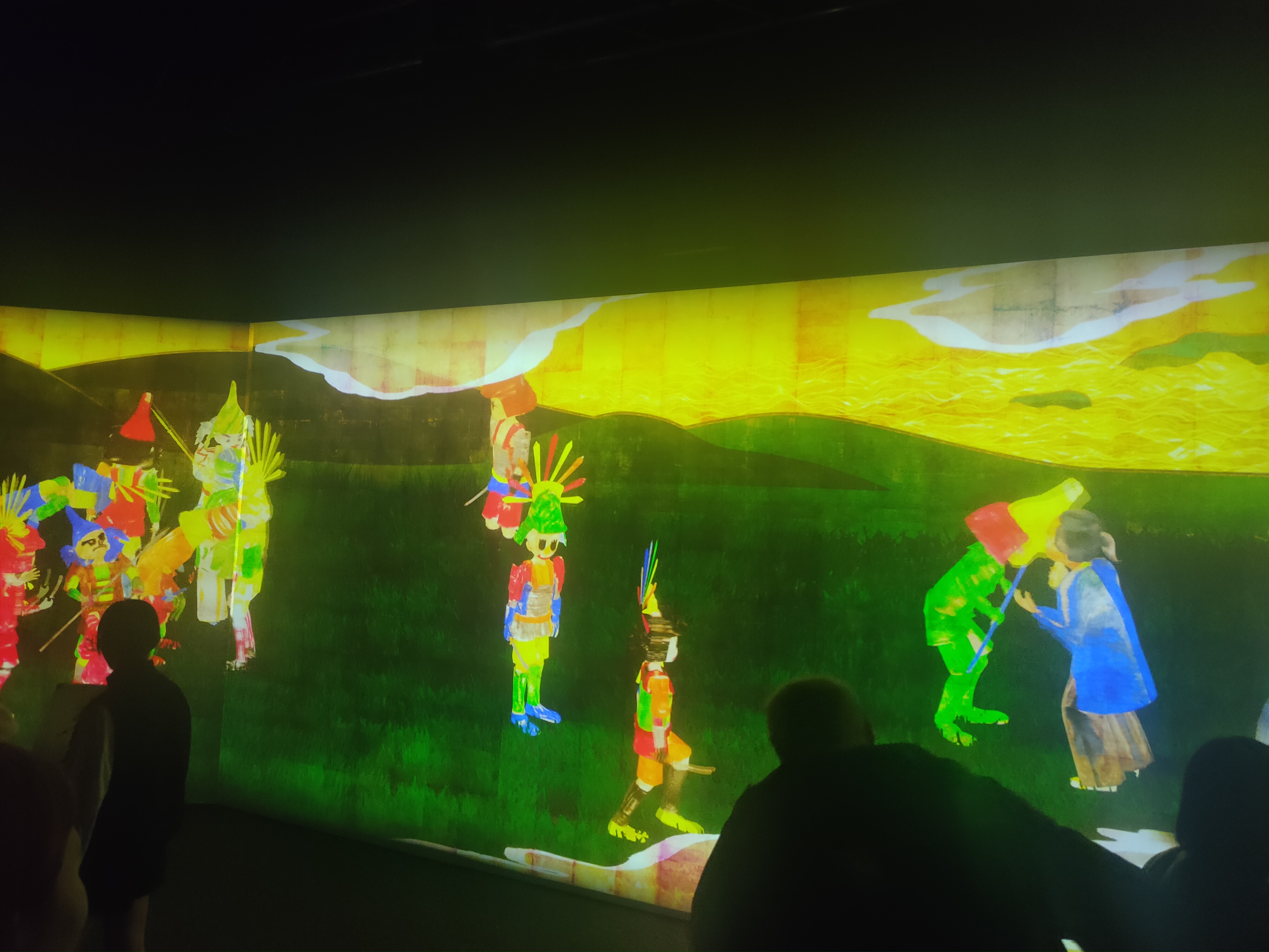 Am Ausgang gab es noch eine Ausmalstation, bei der man ein Samurai-Ausmalbild selbst gestalten konnte. Dieses wurde eingescannt und dann erscheint die gemalte Figur animiert auf der großen Leinwand. Man kann sogar mit seiner Figur interagieren, indem man sie anfasst. Es erscheint dann ein bekannter Spruch des jeweiligen Samurai (nur auf japanisch). Das war schon sehr cool.