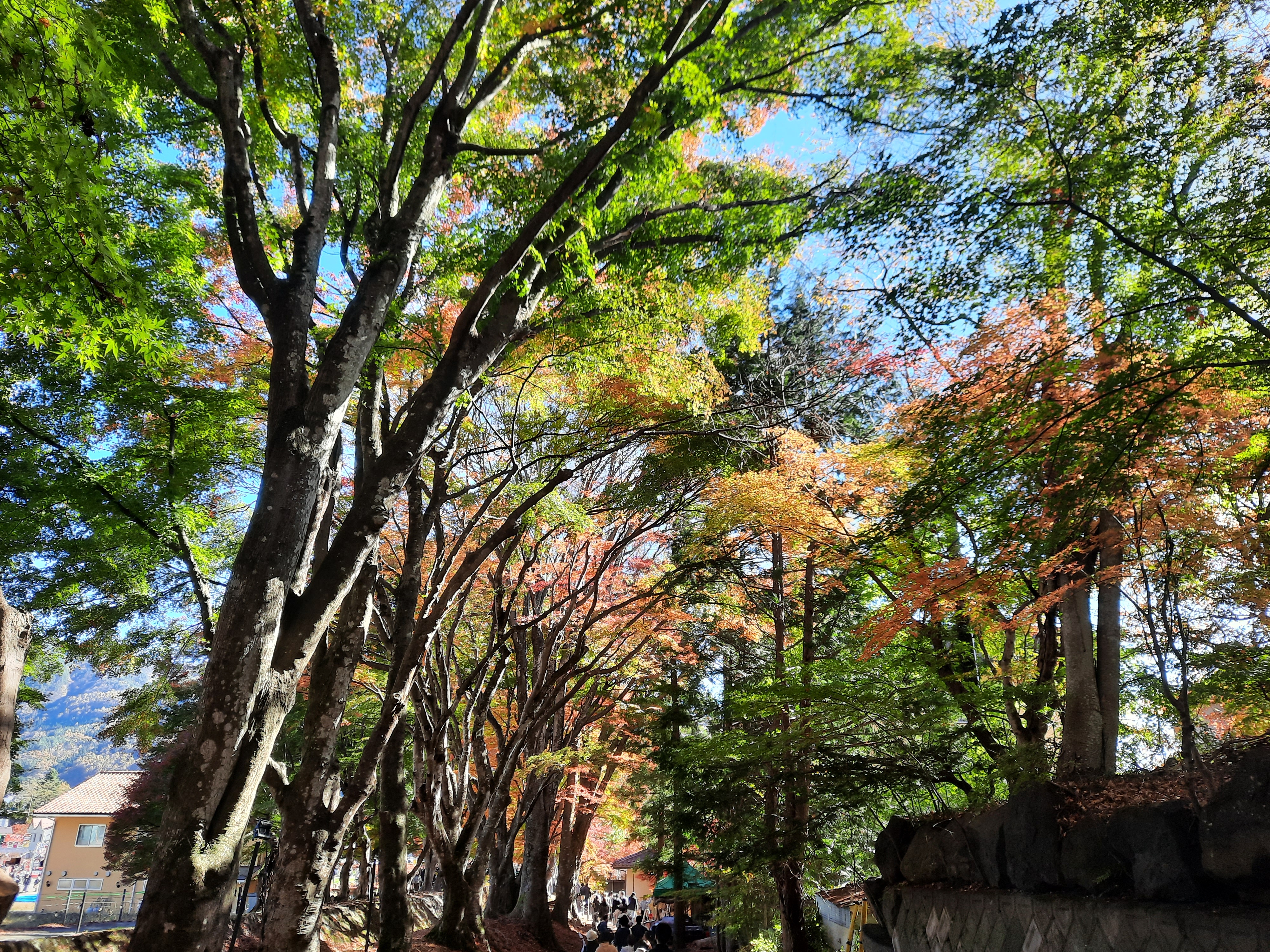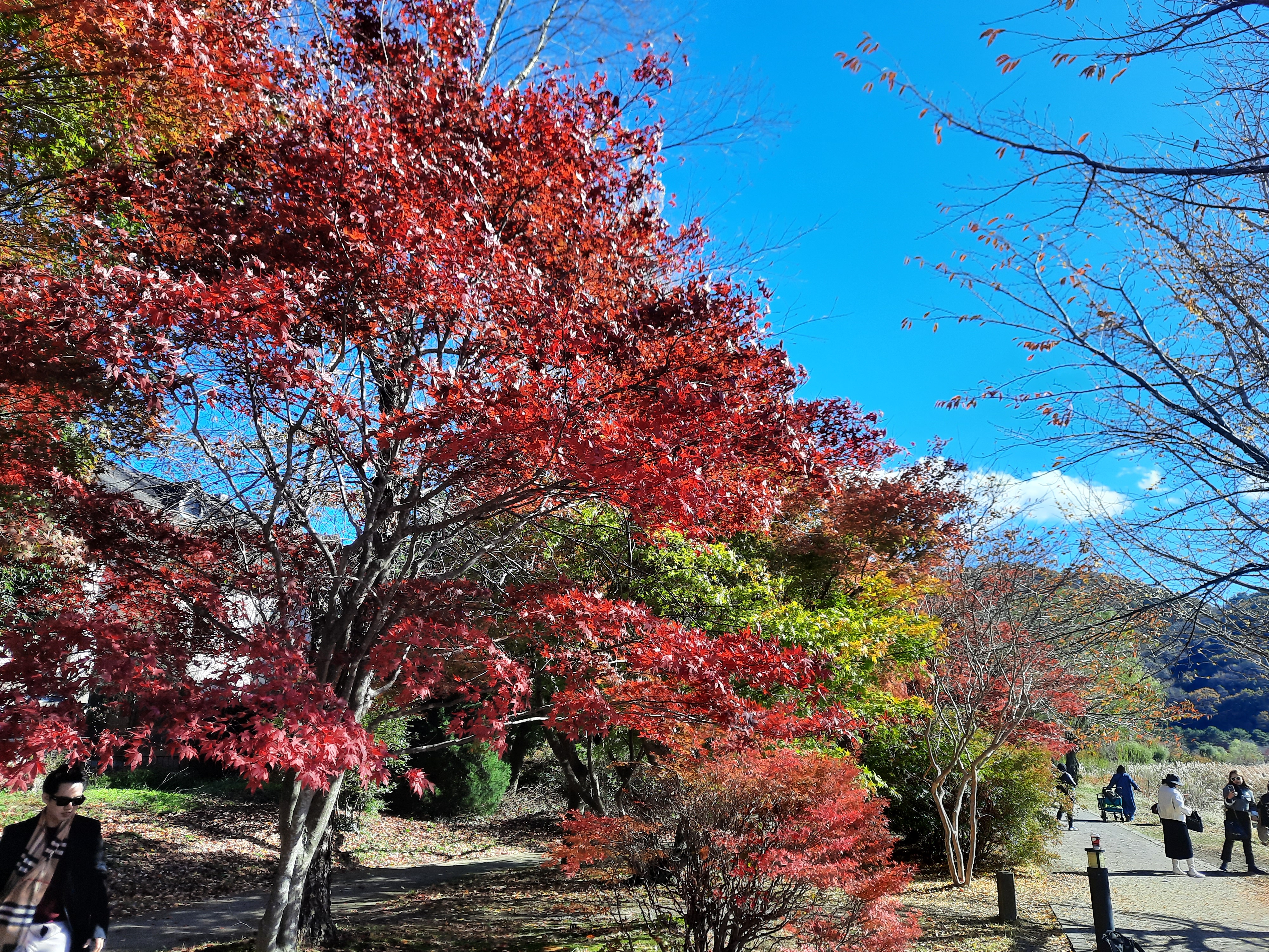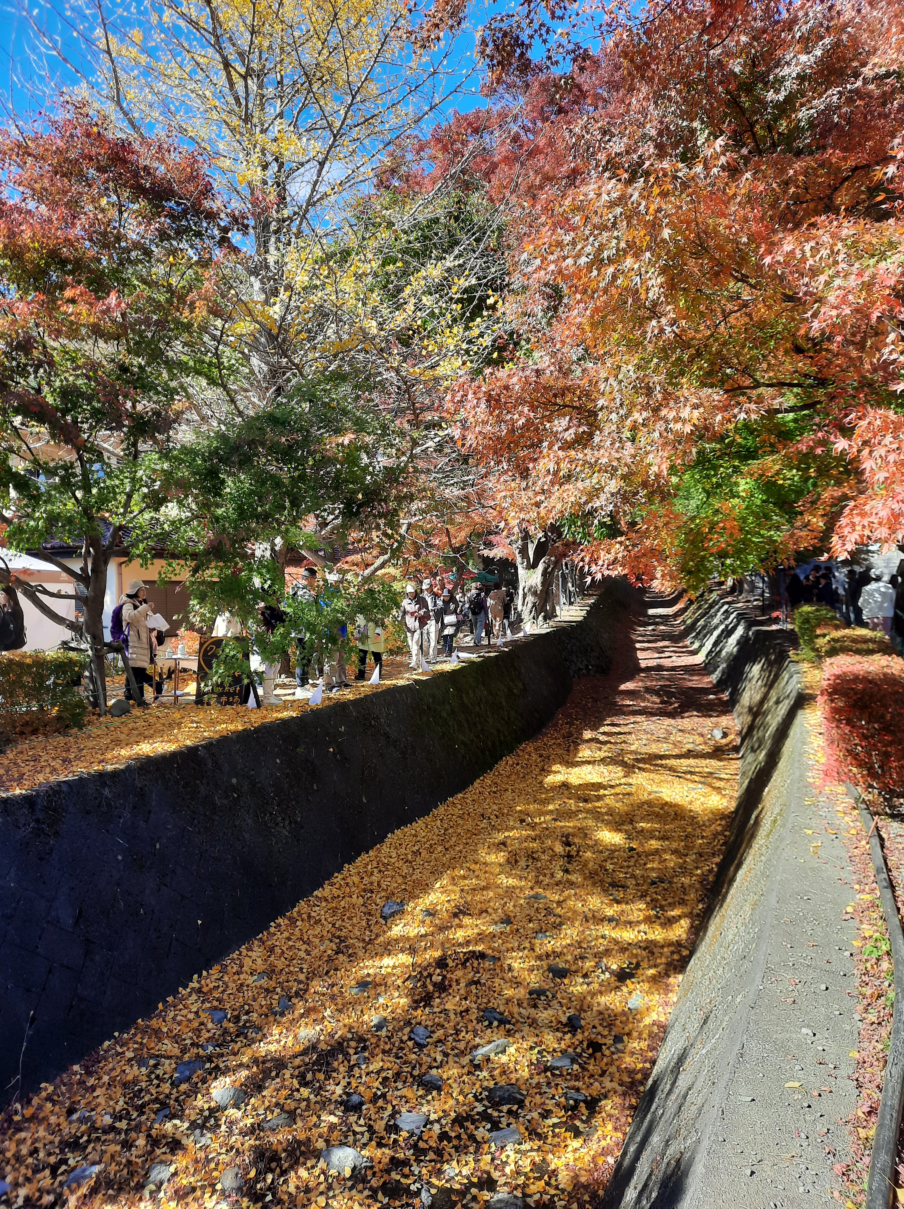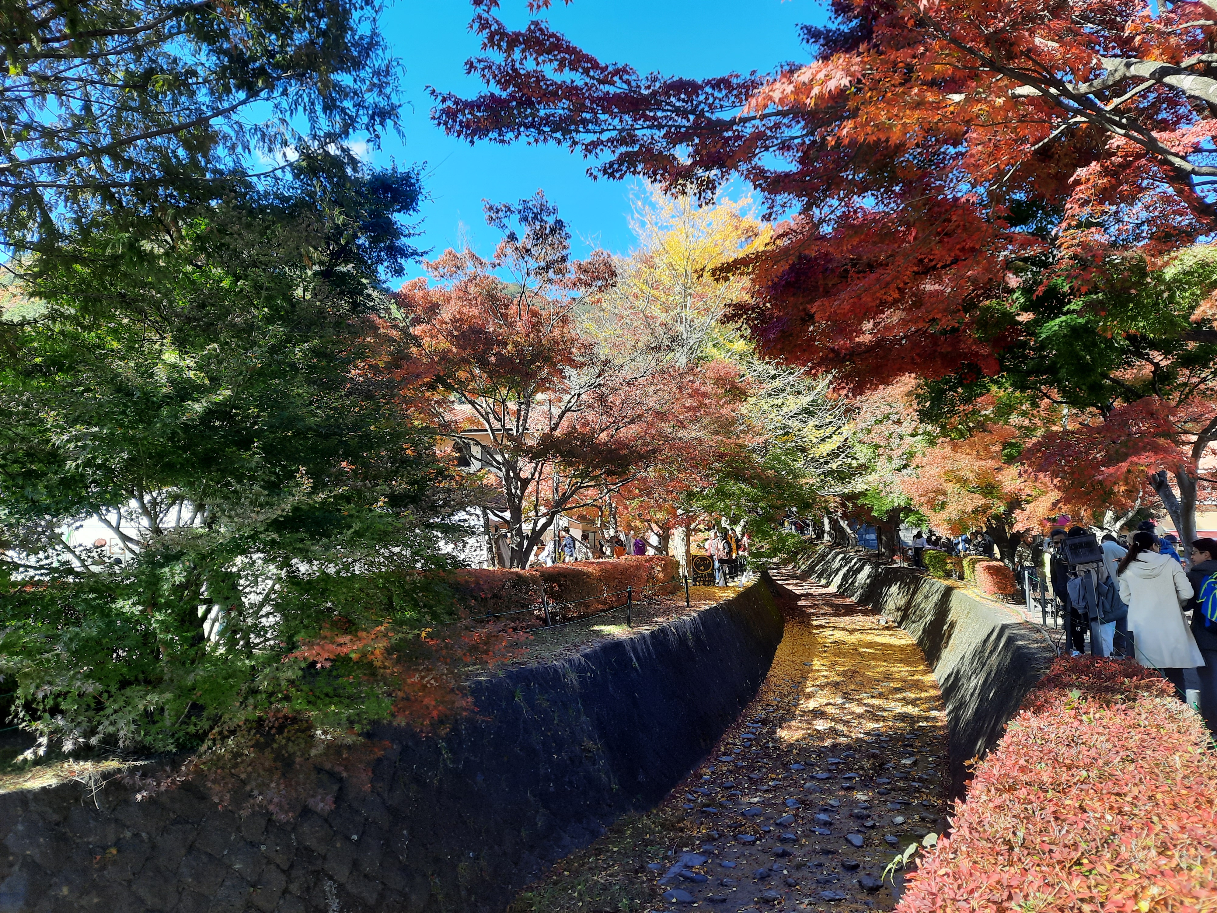 Unterwegs kommen wir am Momiji-Korridor vorbei und können auch endlich das rote Herbstlaub sehen. Entlang eines kleinen Kanals am See steht eine Allee von Momiji (Ahorn-Bäumen), die in allen Farben leuchten.