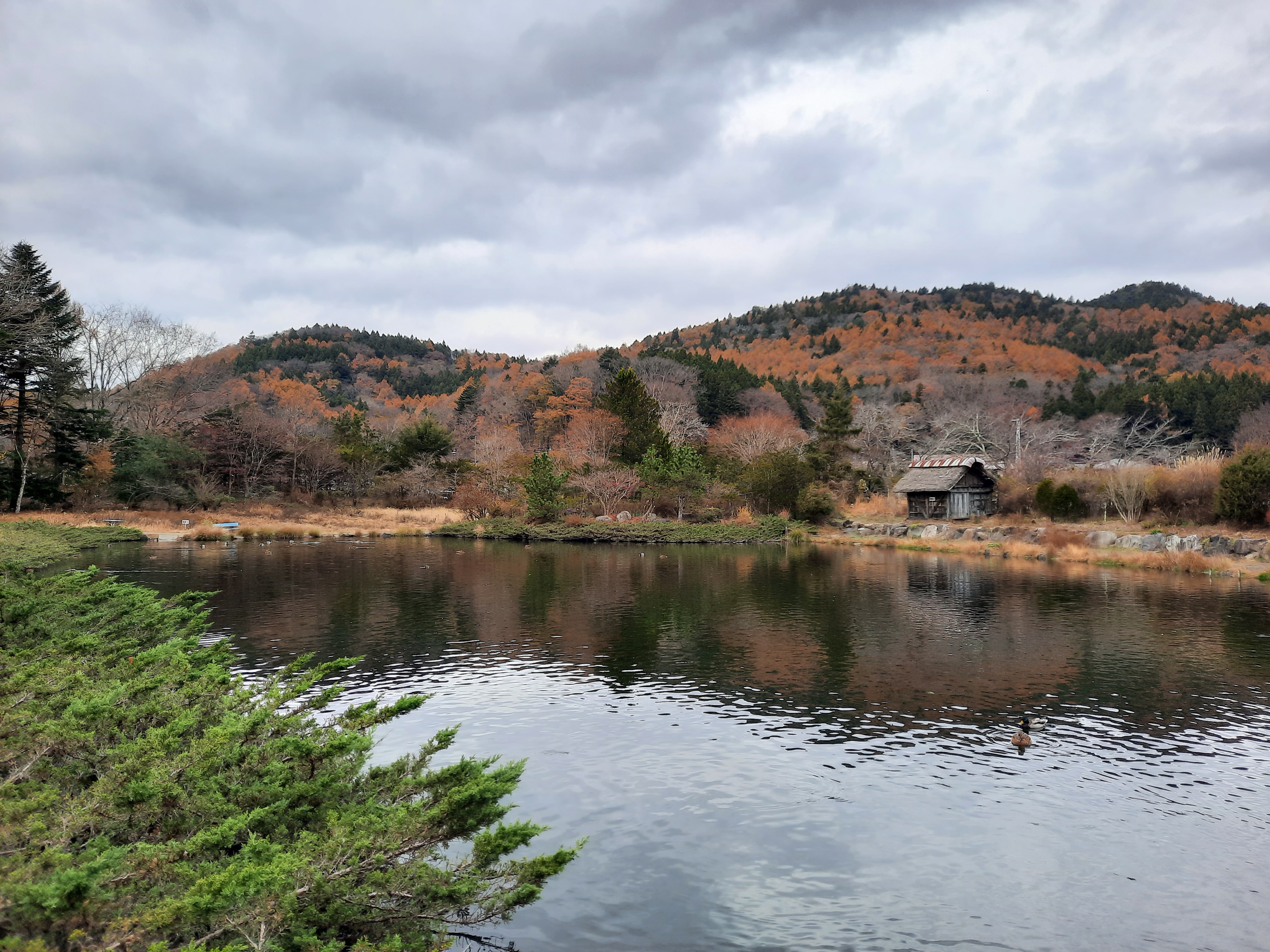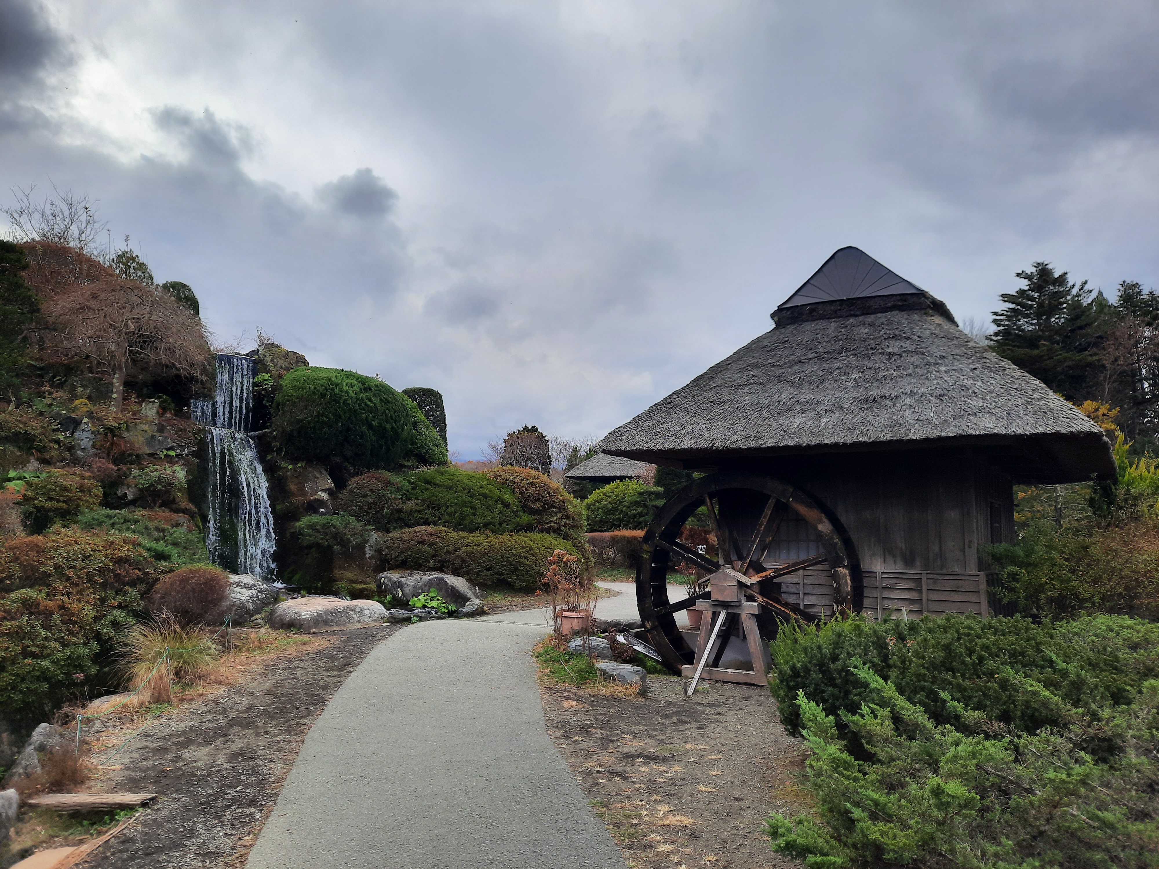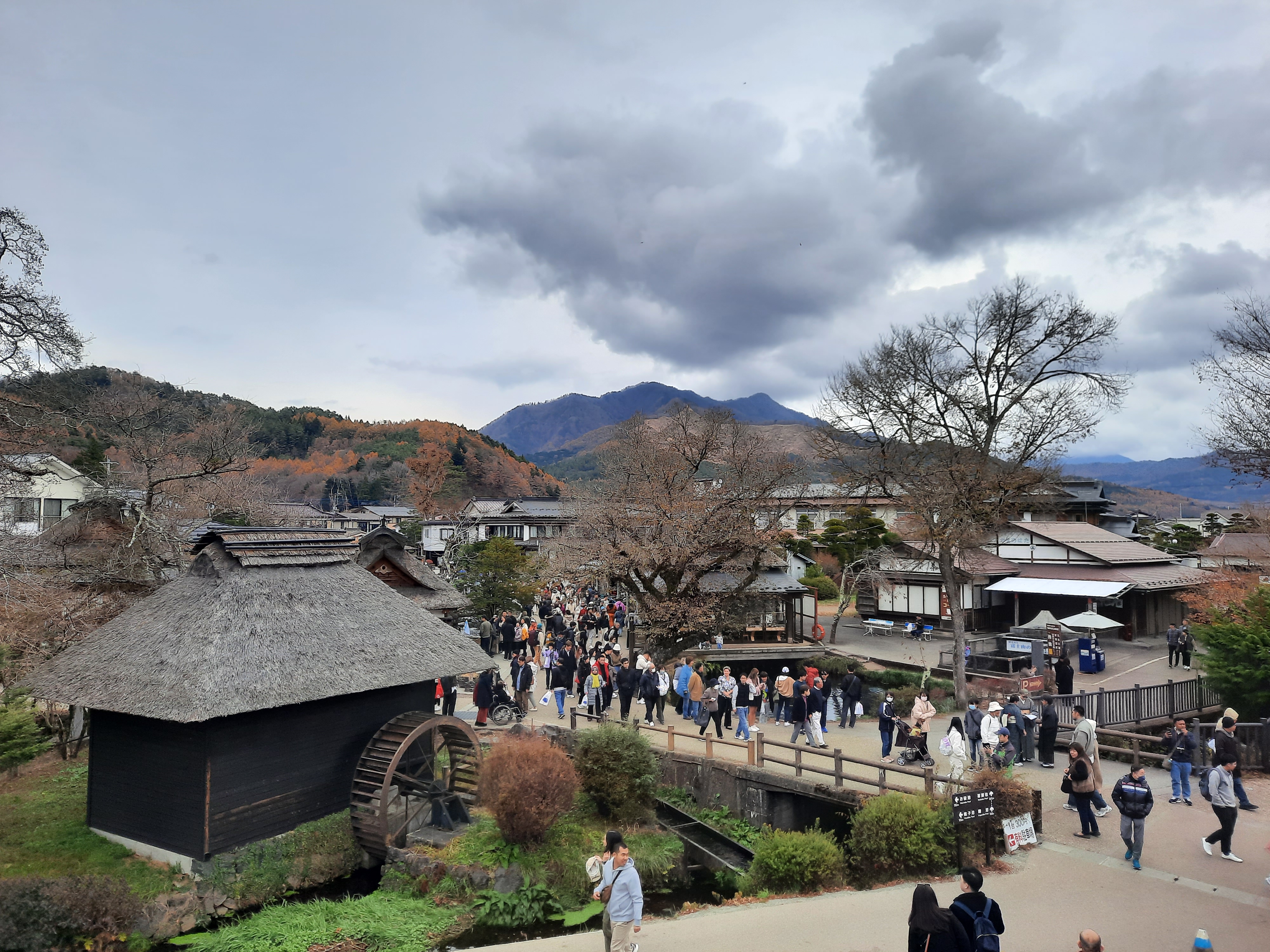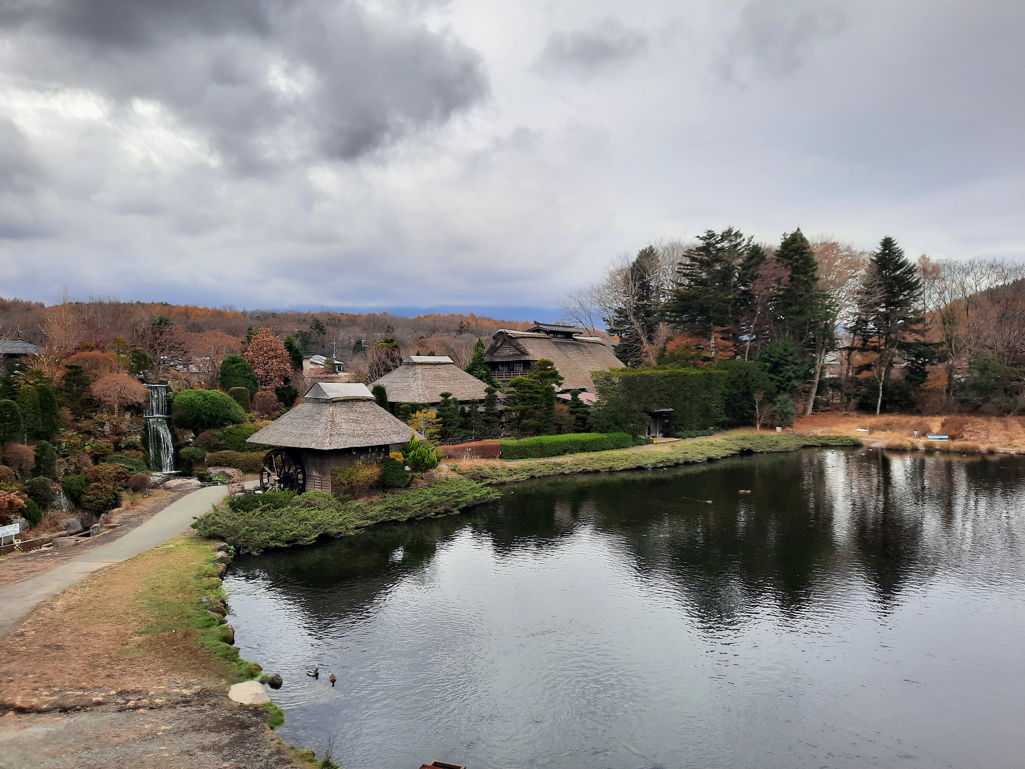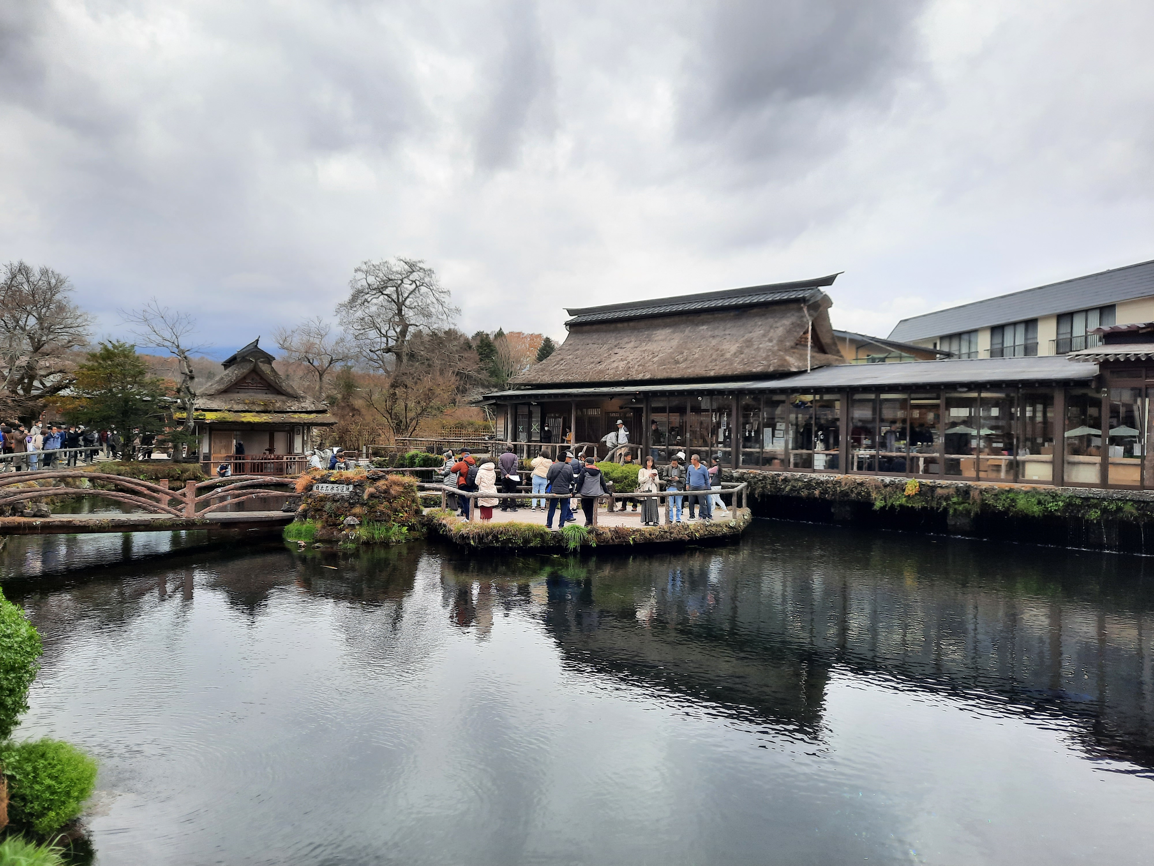 Am nächsten Tag ist es überwiegend bewölkt und man spürt überall die Enttäuschung der Tagestouristen. Aber auch ohne sichtbaren Fuji gibt es einiges zu erleben. Wir fahren in das Dorf Oshino und besichtigen Hannoki Bayashi Shiryokan, ein kleines Freilichtmuseum in dem man die alten Reetdach-Bauernhäuser sehen kann. Nebenan ist ein Park mit Shops und mehreren Teichen aus frischem Wasser vom Fuji, zu dem Busse voller Touristen gekarrt werden. Für das kostenpflichtige Freilichtmuseum (300¥) und dessen Premium-Aussichtsplattform interessieren sich außer uns fast nur Japaner.
