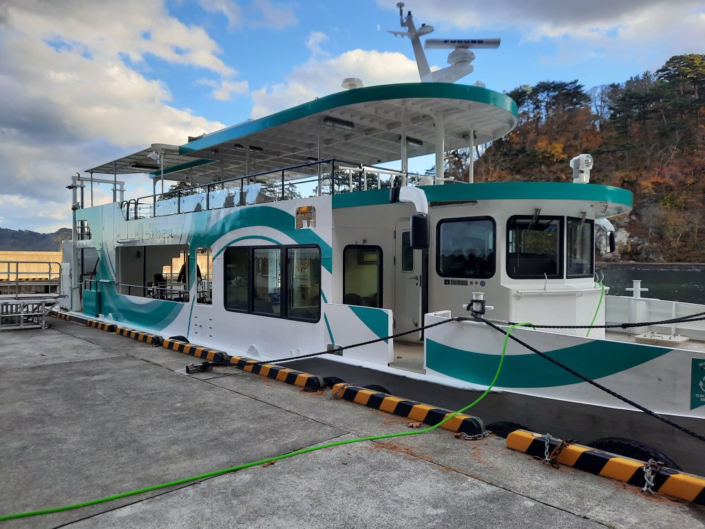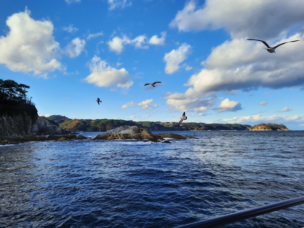 Da wir schnell genug angekommen und unser Gepäck losgeworden sind, schaffen wir es noch auf die letzte Bucht-Rundfahrt der Umineko-Maru. Das kleine Sightseeing-Boot fährt ein Stückchen auf das Meer hinaus und macht eine schöne Rundfahrt durch Bucht und den Hafen von Miyako. Zwischendrin kann man die Umineko, die ansässigen Seemöwen füttern. Umineko bedeutet Meerkatze (Katzen, wo?).