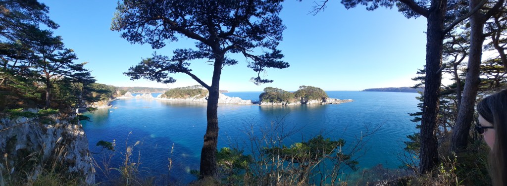 Auf einer Halbinsel in der Bucht von Miyako, etwas außerhalb der Stadt, befindet sich Jodogahama, der Strand des reinen Landes. Wir checken im Hotel oberhalb der Klippen ein und machen uns auf den Weg nach unten. Eine Treppe durch den Wald, „Stairs of Happiness“ genannt, verbindet das Hotel und die Uferpromenade unterhalb der Klippen. Sobald man die 109 Stufen geschafft hat, wird man schon mit der atemberaubenden Aussicht belohnt.