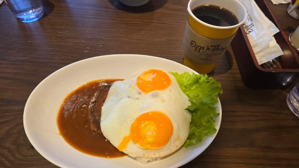 Nachdem wir ausgerüstet sind, beschließen wir uns noch in einem nahegelegenem Hawaii-Themen Cafe zu stärken. Wir haben alle Unterkünfte auf unserer Reise ohne Frühstück gebucht, um möglichst viele verschiedene Dinge zu probieren. Und oft ist es viel schwerer sich für eine Option zu entscheiden, als etwas leckeres zu finden!
