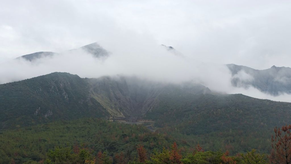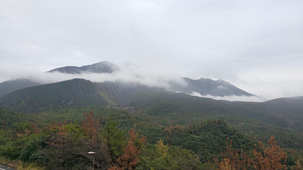 Am Ende des Weges besteigen wir einen Bus, der uns zum Yunohira Observatorium am höchsten Punkt des Berges bringt welcher noch betreten werden darf. Dort bietet sich uns eine phänomenale Aussicht mit schnell wechselnden Wolken am Berg.