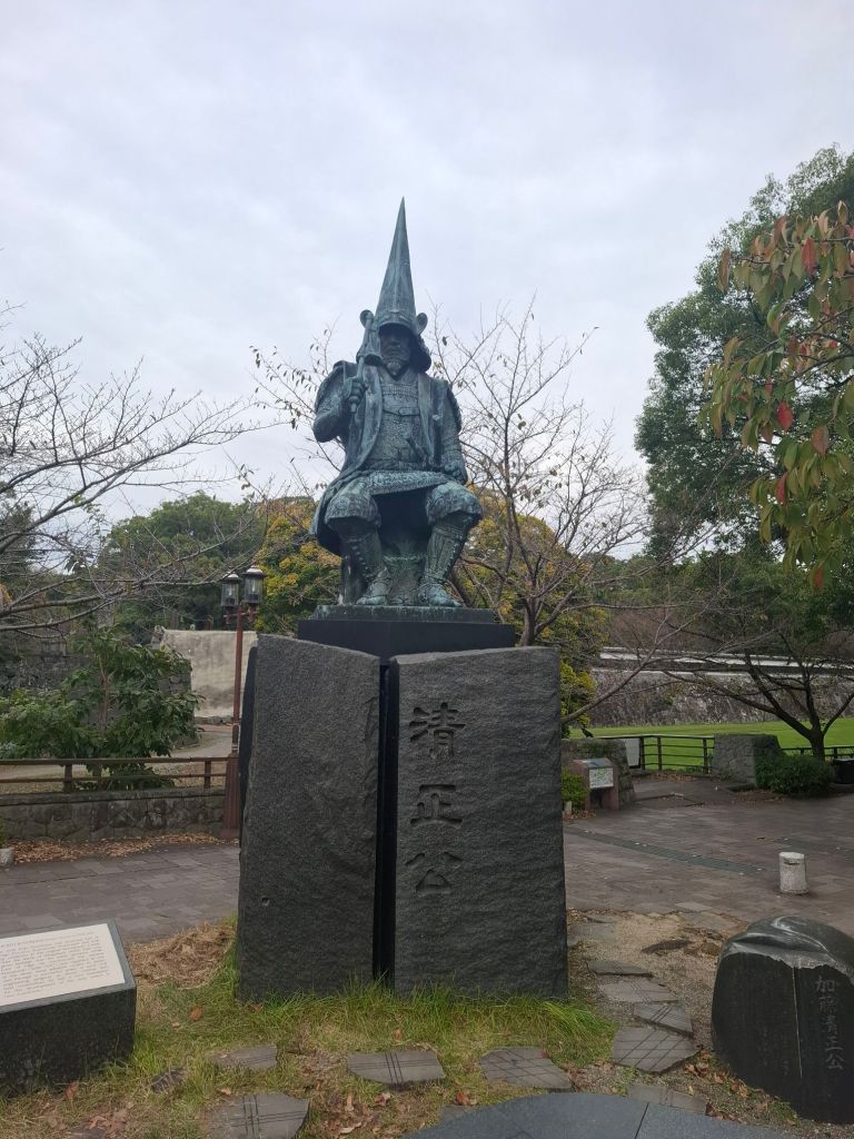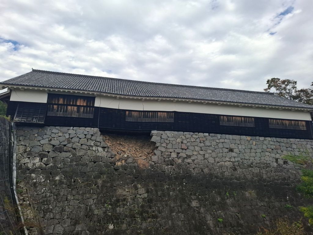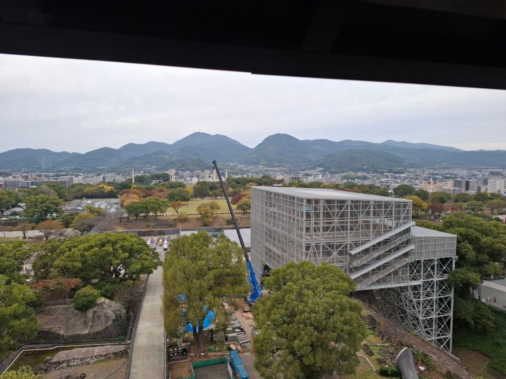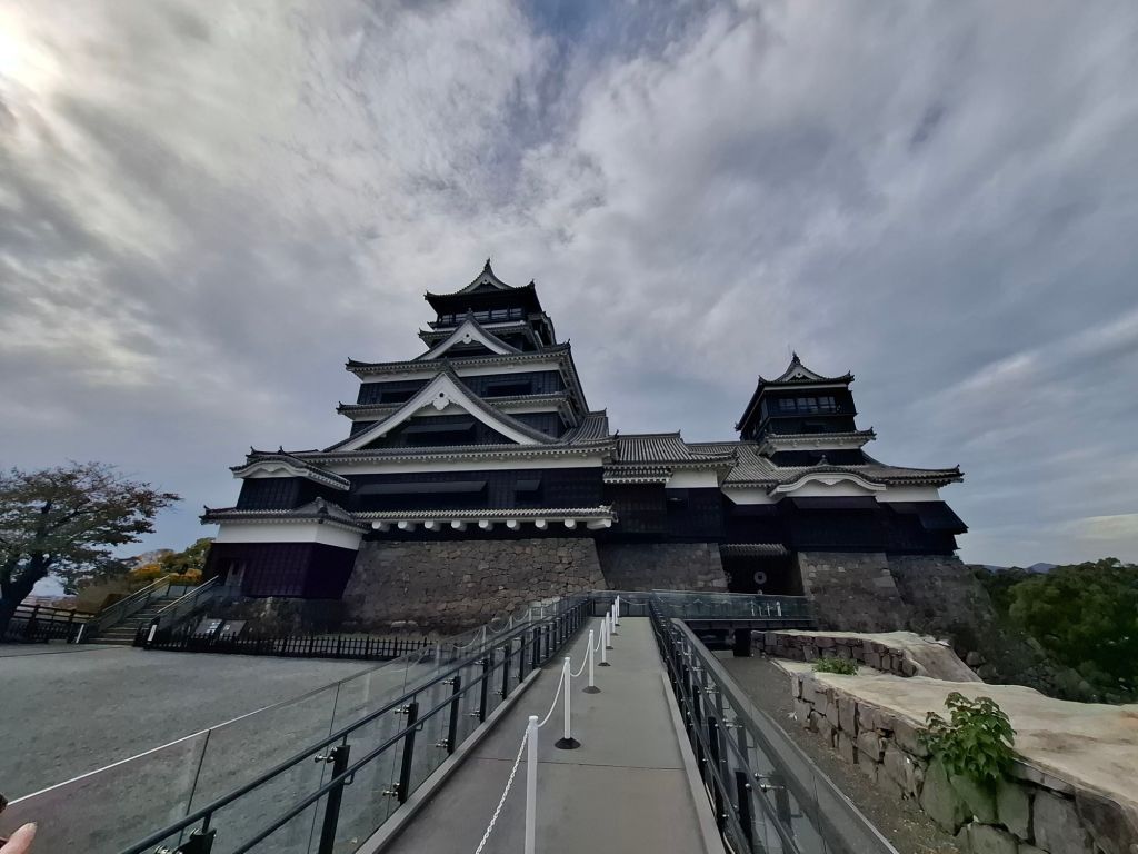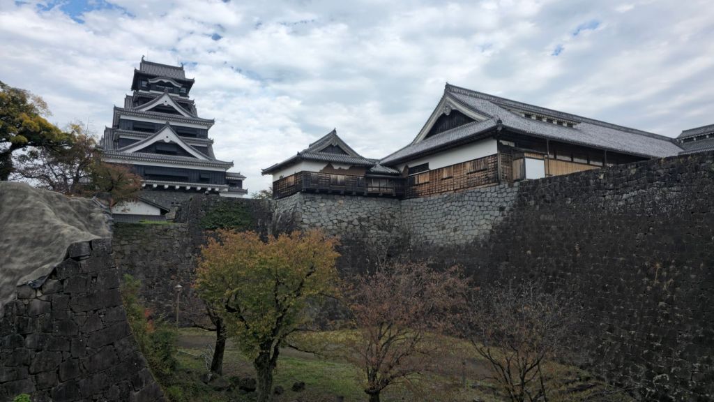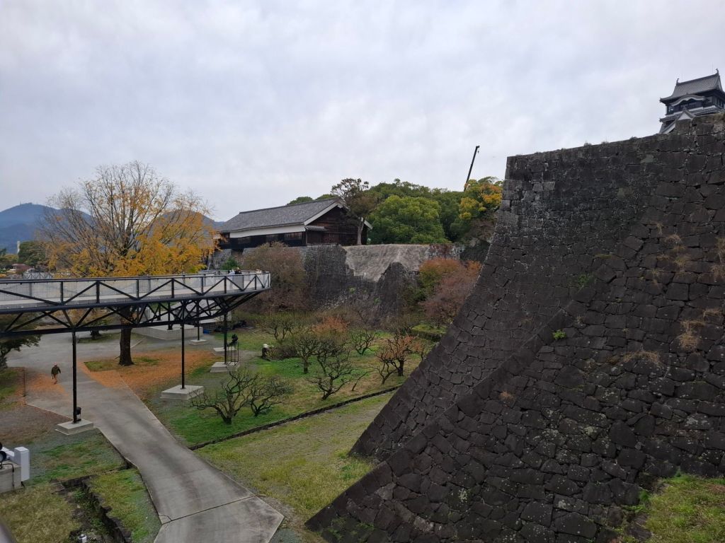 Nachdem wir es aus der Stadtverwaltung wieder heraus geschafft haben, machen wir uns auf den Weg zur Burg. Nach nur wenigen Schritten sind wir schon am Burggraben und können die schöne Burgmauer und den Graben bewundern. Nach Betreten des Burggeländes werden wir auf eine ca. 6 Meter hohe Fußgängerüberführung geleitet. Anderes als bei den anderen Burgen, die wir bisher besichtigt haben, können wir hier nur indirekt durch die Burganlage laufen, denn das gesamte Gelände wurde bei einem großen Erbeben 2016 schwer beschädigt und befindet sich seitdem und noch bis 2042 in Restaurierung und Wiederaufbau. Über die Brücke kann man den aktuellen Stand der Arbeiten beobachten und sich auch einige beschädigte Stellen anschauen, die erst in dem nächsten Jahren repariert werden. Man kann sich kaum vorstellen, wie stark das Erbeben war um so alte Steinmauern in die Knie zu zwingen…