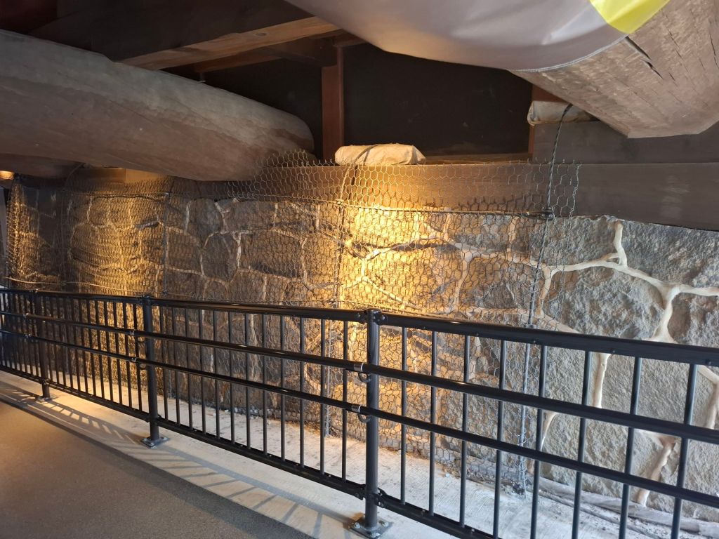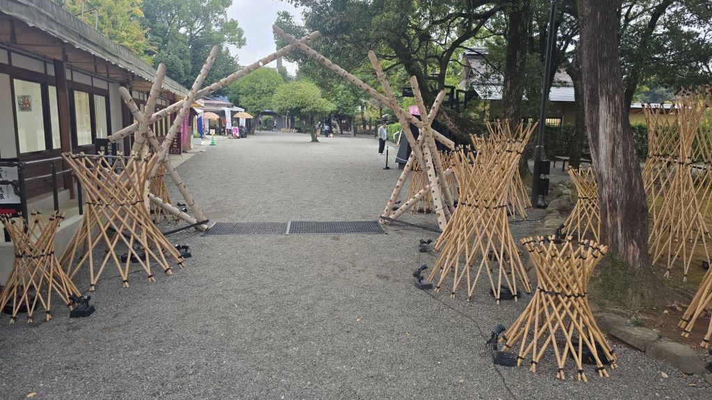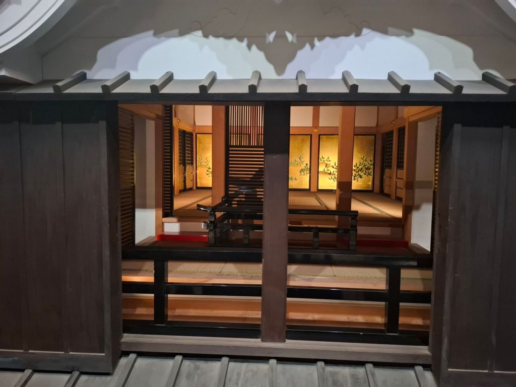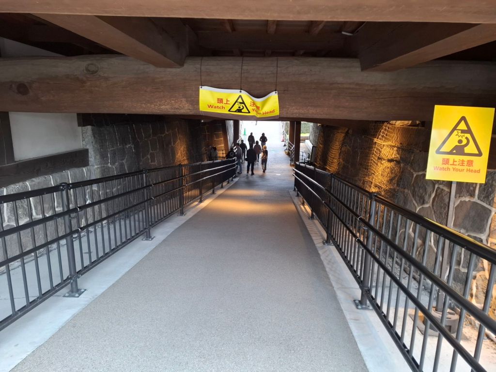 Am Ende der Überführung geht es dann nochmal steil abwärts und fast unter die Erde. Die „Dunkle Passage“, eine Art historische Unterführung und Teil der Verteidigungsanlage, unterhalb des Honmaru-Palasts kann durchquert werden und unsere Köpfe passen tatsächlich noch unter die großen, schweren Holzbalken der Decke.