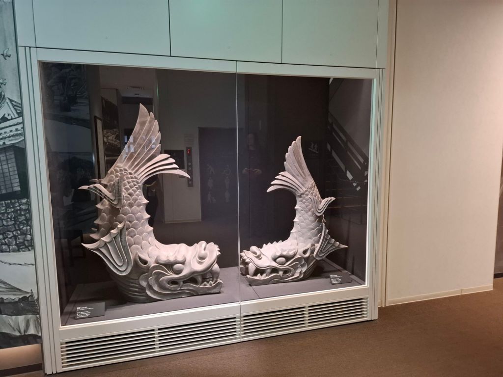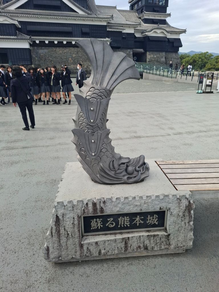 Am anderen Ende wartet bereits der Vorplatz zum Tenshukaku, der Hauptburg. Hierbei handelt es sich um einen Nachbau der Originalburg mit einem Museum über 6 Stockwerke. Das Gebäude wurde 2021 als erstes nach dem Erbeben wieder für Besucher geöffnet. Während wir das schöne Tenshukaku bewundern treffen auf dem Vorplatz beinahe im Minutentakt Schulklassen ein, die unseren Museumsbesuch noch beeinflussen werden.