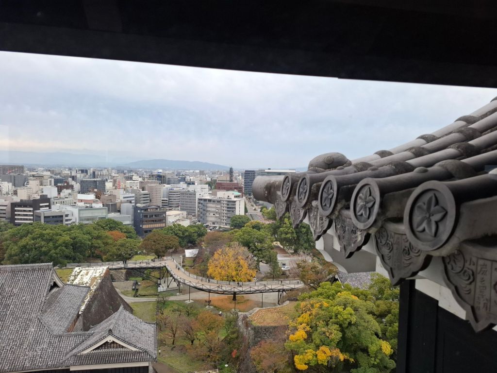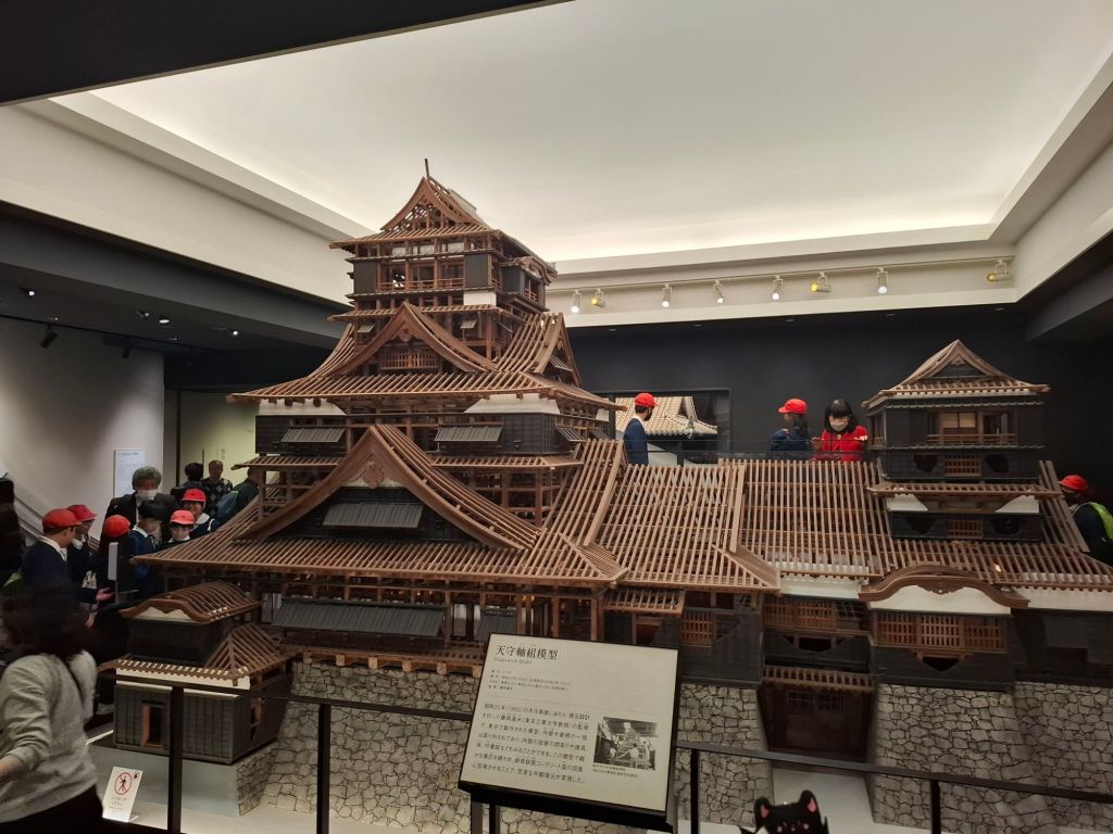 Im Museum wird über die einzelnen Stockwerke verteilt die Geschichte der Burg und des Wiederaufbaus nach dem Erbeben gezeigt. Die Schilder sind leider nur auf japanisch und obwohl es eine Art englischen Audioguide gibt, ist es jedoch kaum möglich ihn zu benutzen, denn im inneren ist es insbesondere wegen der Schulklassen sehr voll und laut und warm. Wie auch in den anderen Burgen wird jedes Stockwerk etwas kleiner und wärmer, aber immerhin ohne die immer kleiner und steiler werdenden Treppen! Oben angekommen gibt es wie immer eine Aussichtsplattform in alle Richtungen, bevor man wieder die Treppe runter geht – diesmal ohne Druck, denn auch den Japanern ist es oben viel zu warm.