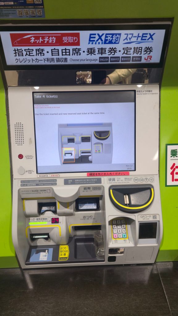 Mittlerweile routiniert fahren wir mit der Straßenbahn vor unserem Hotel Richtung Shinkansen Bahnhof. Die kostenlosen Sitzplatzreservierungen haben wir vorab besorgt. Das kann man gut Abends machen, wenn die Schalter in den Bahnhöfen frei sind. Da es Sinnvoll ist, dies ein-zwei Tage im voraus zu machen, binden wir solche Sachen in späte Ausflüge oder Spaziergänge ein.